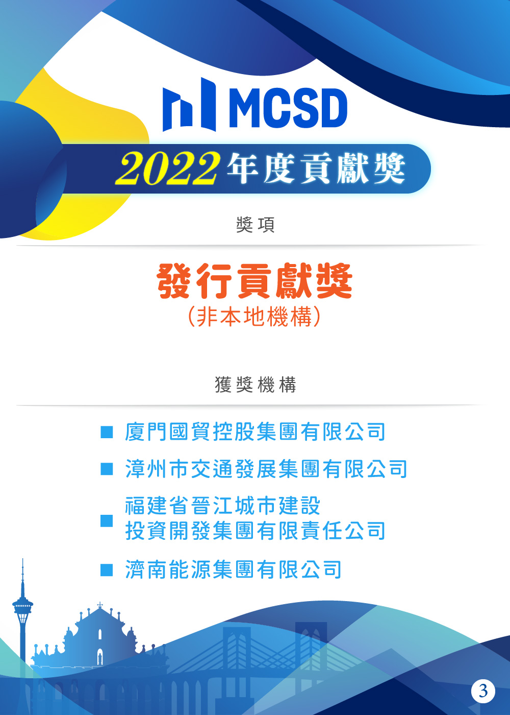 為嘉許於2022年對澳門債券市場有突出貢獻的市場參與者, MCSD於活動上頒發“卓越市場合作夥伴”、“發行貢獻獎”、“承銷貢獻獎”及“卓越市場服務平台”4個獎項,共有25家本地及境外機構獲獎。