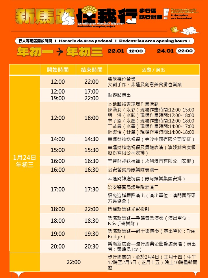 “新馬路任我行——步行區試行計劃”旨在以新穎體驗角度帶領公眾遊賞新馬路一帶的風景及建築,透過注入文化力量,盤活社區經濟,豐富文旅融合體驗,宣揚澳門作為“以中華文化為主流、多元文化共存的交流合作基地”的多元美學城市形象。為配合活動的進行,海邊新街至龍嵩正街的新馬路地段(亞美打利庇盧大馬路)由1月22日早上8時至1月24日晚上12時,以及2月4日早上8時至2月5日晚上12時封閉交通,詳情可留意交通事務局公佈之交通安排。有關計劃詳情,可瀏覽文化局網頁 www.icm.gov.mo 、Facebook專頁“IC Art 藝文棧”及微信專頁“澳門文化局IC”。