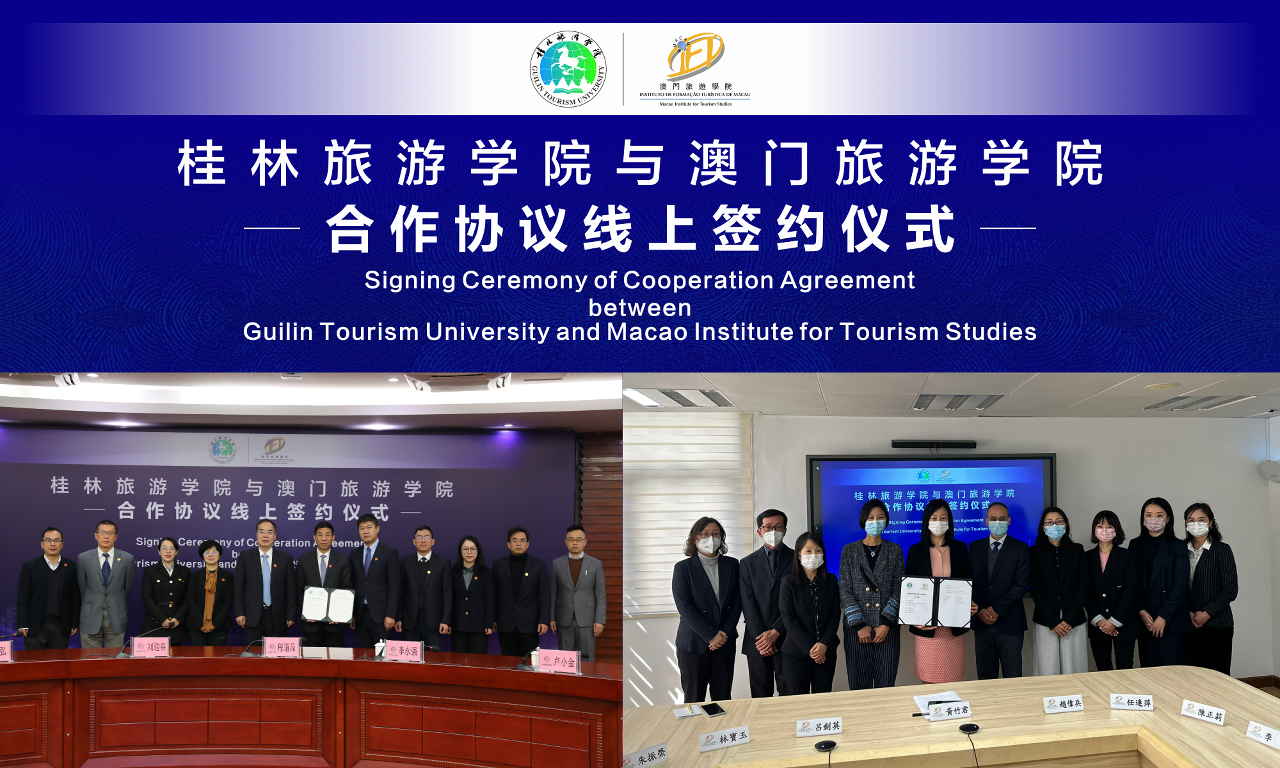 上月,澳門旅遊學院與桂林旅遊學院簽署新合作協議。線上簽約儀式在桂林和澳門兩地同步舉行,由澳門旅遊學院院長黃竹君及桂林旅遊學院校長程道品代表簽署。
