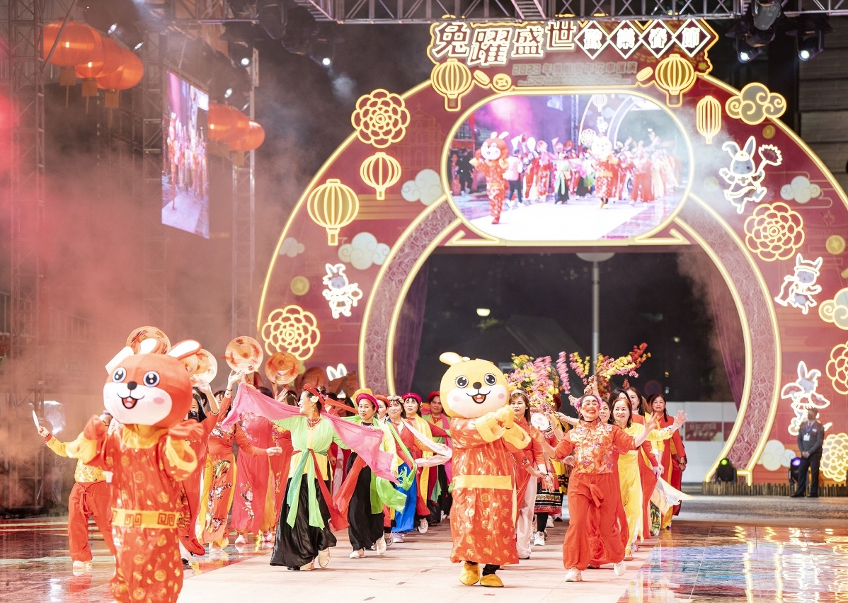 大年初一及初二,財神、福祿壽三星、金童玉女、兔生肖及澳門旅遊吉祥物“麥麥”將到不同地點向大家拜年及派送金元寶,並呈獻龍獅表演,為農曆新年添節慶氣氛,向全澳居民及旅客送上春節祝福。此外,各具特色的定點表演將於不同時段分別在康公廟、十月初五日街及關前街一帶、嘉路米耶圓形地(三盞燈休憩區)、黑沙環公園、氹仔龍環葡韻、大三巴牌坊、媽閣廟前地及祐漢街市公園上演,其中包括肇慶市歌舞團的中式鼓樂舞蹈表演及香港Ziberty花式跳繩表演。