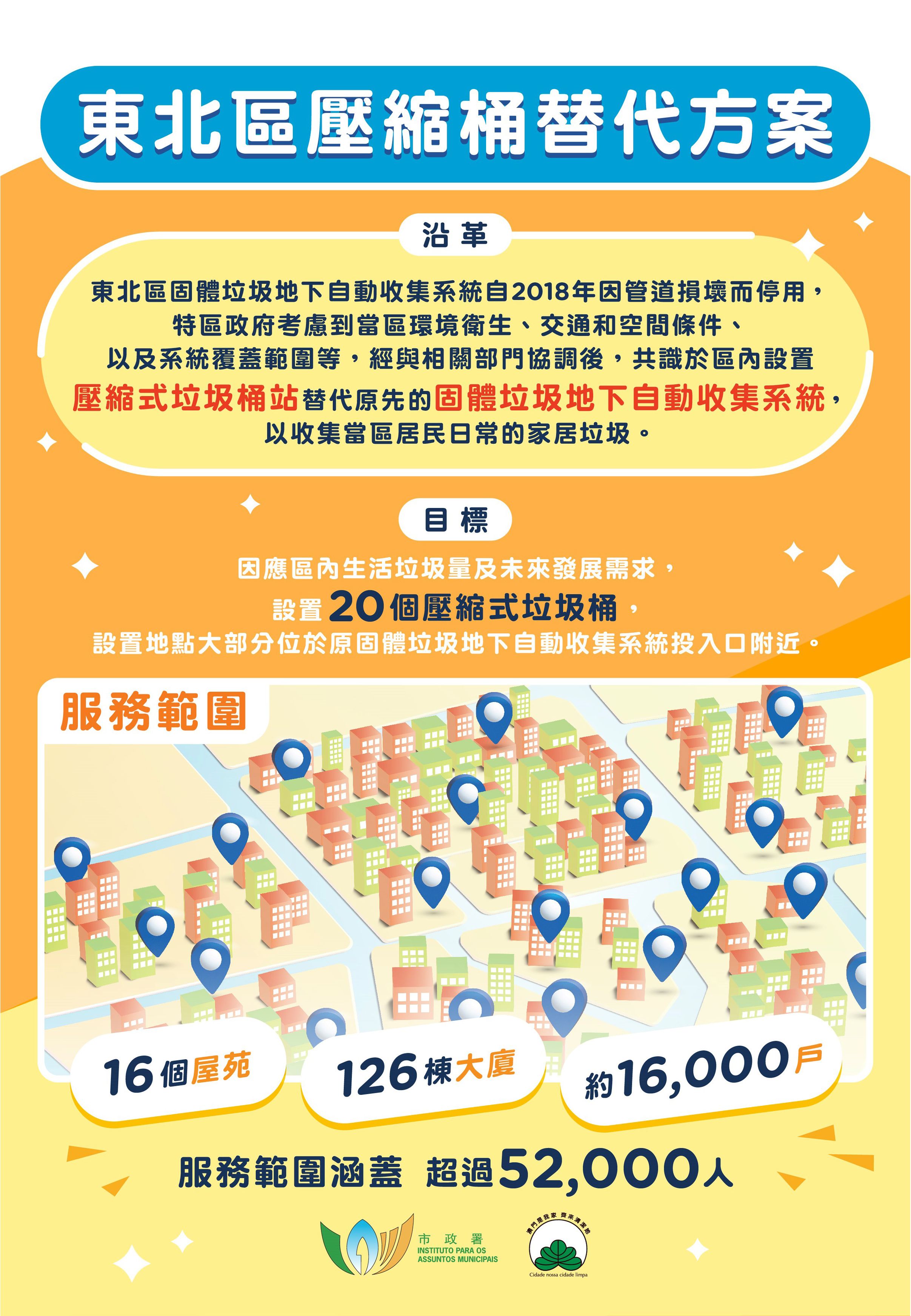 為減少近300個大型垃圾桶置於街上,尤其是推桶衍生的垃圾外露、異味、污水等衛生問題,縮短清運垃圾時間,降低垃圾車噪音對民居、商號的影響,舒緩垃圾車頻繁出動對區內交通的壓力,經與環保局、清潔專營公司溝通,實地檢視以及聽取地區團體、市諮委、區內居民和商舖的意見,綜合對區內交通等分析,市政署在區內選定20個鄰近或位於原垃圾自動收集系統的地點設置壓縮式垃圾桶,以處理每天龐大的垃圾量。