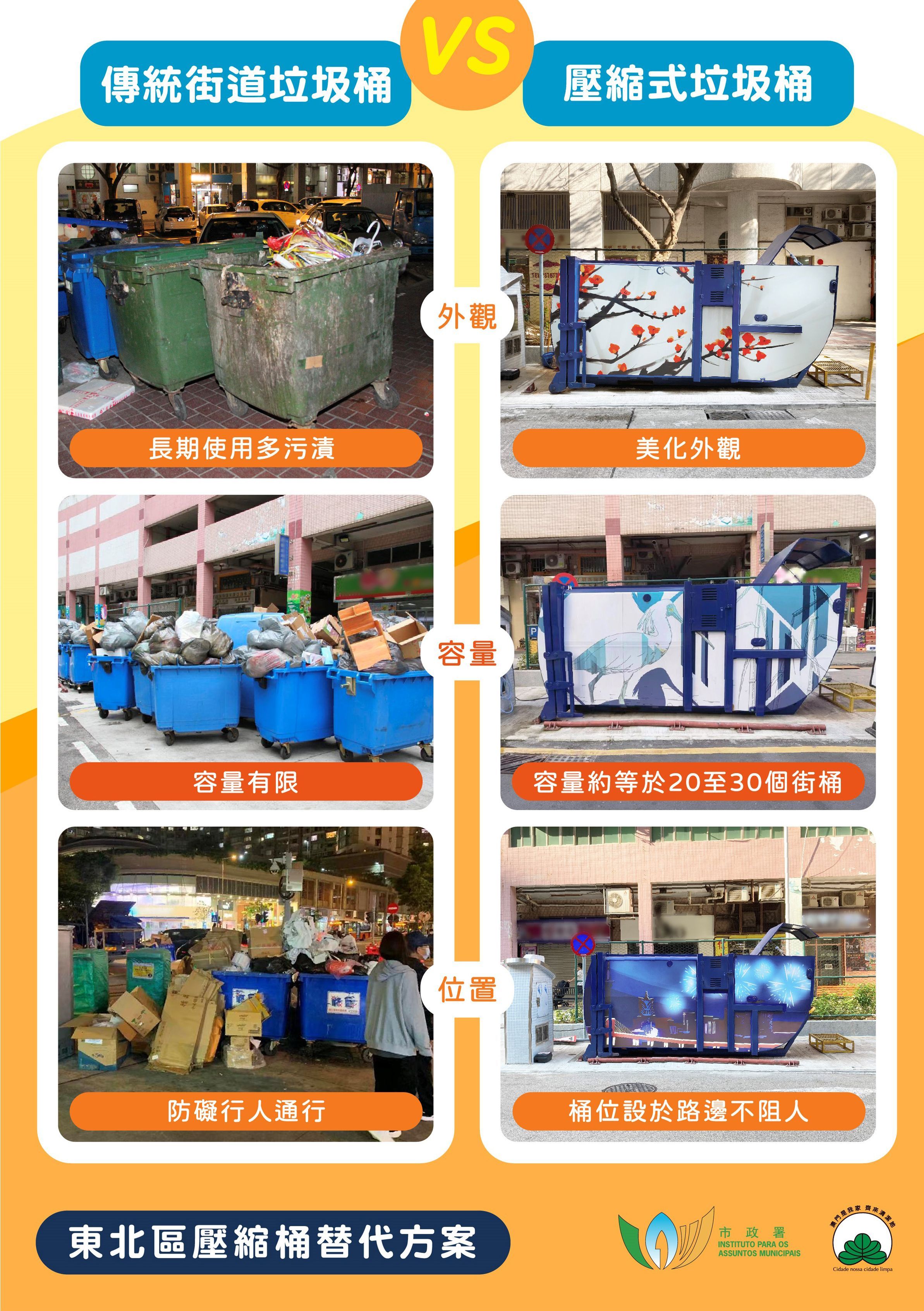 目前,全澳有壓縮式垃圾桶124個、封閉式垃圾房122個,傳統垃圾桶數量已由高峰期逾1,600個減少至104個,減幅逾9成。市政署未來將持續推動系列優化垃圾收集措施,包括:在壓縮式垃圾桶增設自動投入口,提升密封性及便利性;受環境空間所限,未具條件設置壓縮式垃圾桶或封閉式垃圾房的垃圾站,加設覆蓋外箱,外箱上蓋以液壓裝置牽引,居民輕踩腳踏即開啓上蓋,棄置垃圾後,上蓋自動關閉,減少臭味飄散和揚塵,避免垃圾外露;增加壓縮式垃圾桶、垃圾房的飾面美化和綠化。