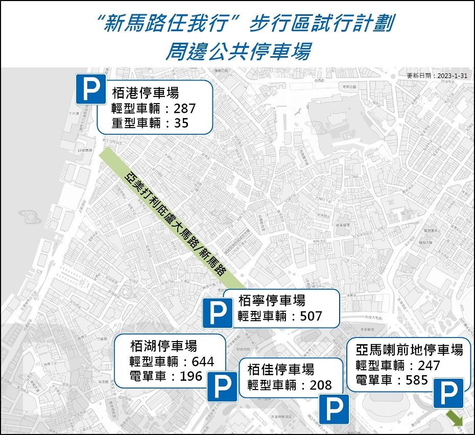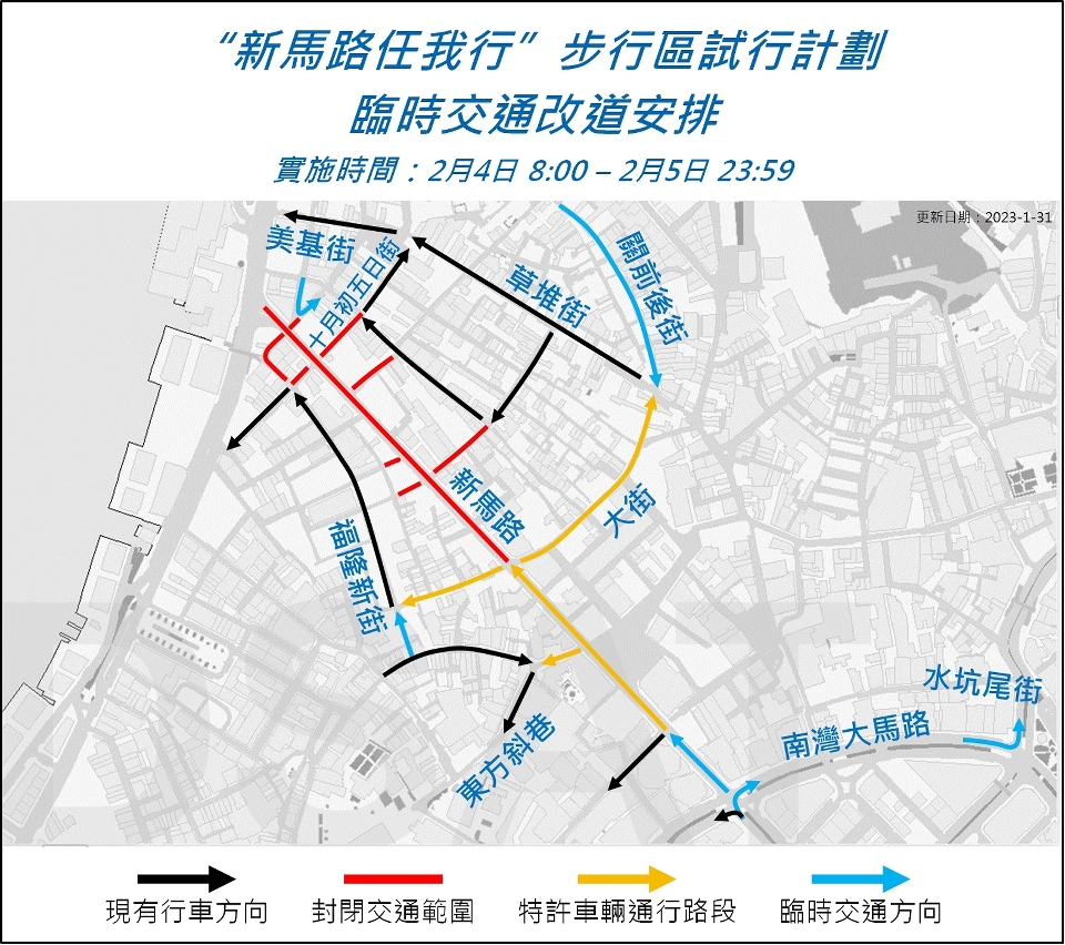 配合文化局續於正月十四及十五舉行“新馬路任我行”步行區試行計劃,2月4日(正月十四)上午8時至5日(正月十五)晚上11時59分,新馬路(亞美打利庇盧大馬路)及周邊道路維持實施封閉交通,部份路段允許特許車輛通行,另部份道路實施反方向行車,以便車輛進出新馬路東西兩側區域之道路(詳見附圖)。上述期間,進入栢寧停車場之所有車輛,須統一經龍嵩正街或傅禮士神父街進入;往返南灣大馬路及十六浦方向之車輛,可繞行西灣、媽閣及下環一帶再駛回原路線。而火船頭街、殷皇子大馬路及南灣大馬路繼續設置臨時上落客區供市民使用。