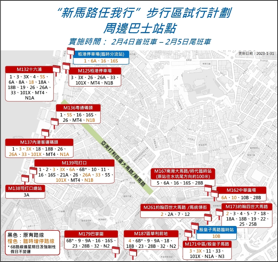 巴士方面,23條日間及4條夜間路線,合共27條巴士路線維持於2月4日(正月十四)及5日(正月十五)的首班車至尾班車期間改道行駛及臨時不停靠新馬路及周邊的部份站點,部份巴士站臨時停用或遷移,並繼續增設5路線特班車(5S)往返火船頭街至華大新村。為進一步疏導及分流往返新馬路的市民及旅客,“栢港停車場”站將增設臨時分流站,供乘搭1、6A、16及16S路線之乘客上落車,而“殷皇子大馬路”站將臨時遷移往南灣大馬路方向10米,並恢復10B路線停靠(詳見附圖)。詳情可留意澳巴網頁 http://www.tcm.com.mo 及新福利網頁 https://www.transmac.com.mo 。