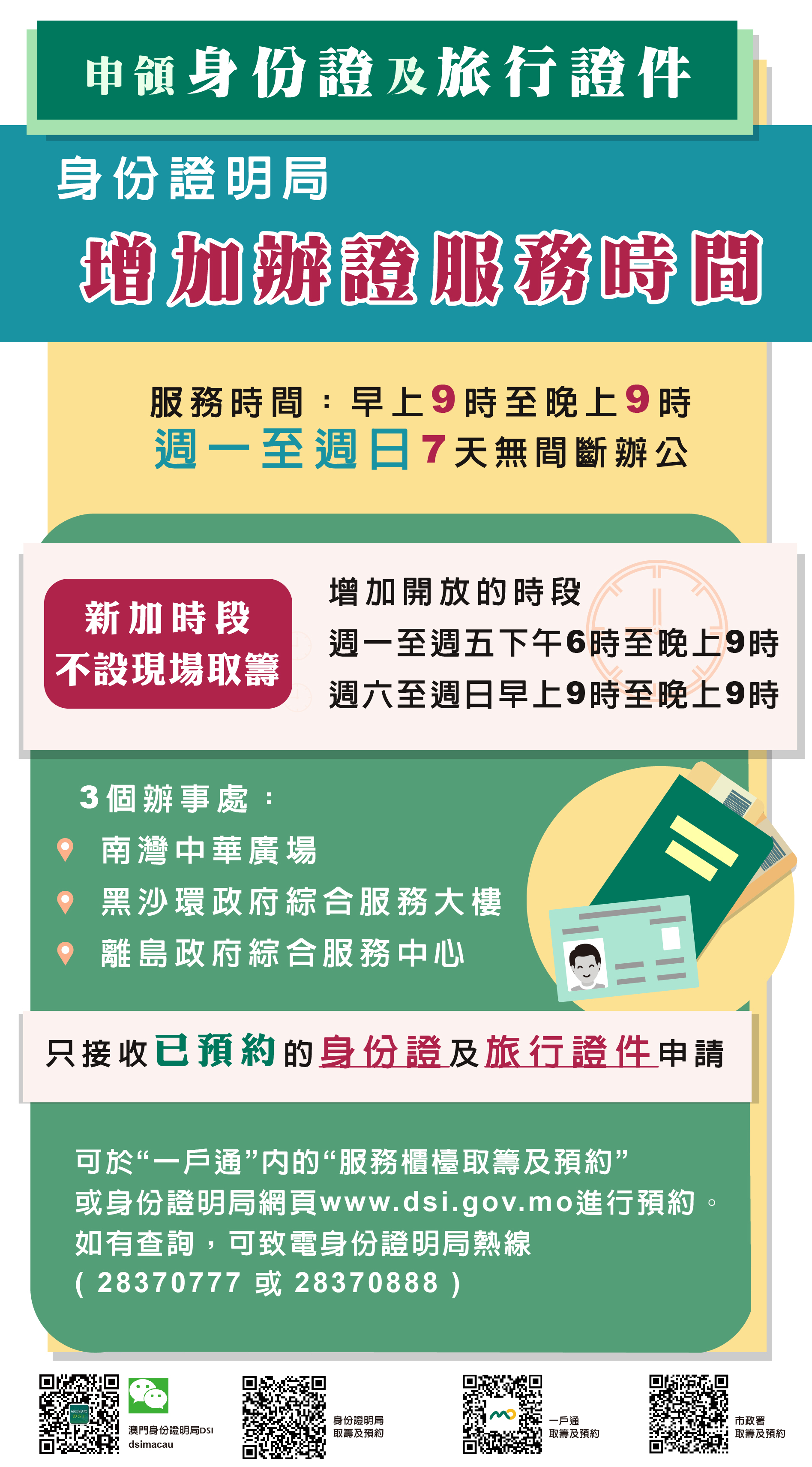 身份證明局呼籲合資格人士優先使用“一戶通”或自助服務機電子辦證,選擇正常辦公時間親臨櫃位的市民,亦建議先行預約,市民可於“一戶通”內的“服務櫃檯取籌及預約”或身份證明局網頁 www.dsi.gov.mo 進行預約,減低排隊和輪候時間。如有查詢,可致電身份證明局熱線(2837-0777或2837-0888)或電郵至info@dsi.gov.mo。