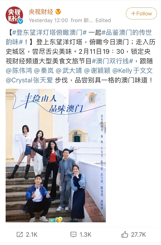 《澳門雙行線》逢周六晚上7點30分在CCTV-2央視財經頻道播出,“央視頻”及“央視財經”手機應用同步播出。第三集“覓世遺 典藏味”將於明(11日)晚播出,打卡團成員將登上東望洋燈塔,俯瞰今日澳門;走入歷史城區,嘗盡舌尖美味,品嘗別具一格的澳門味道。