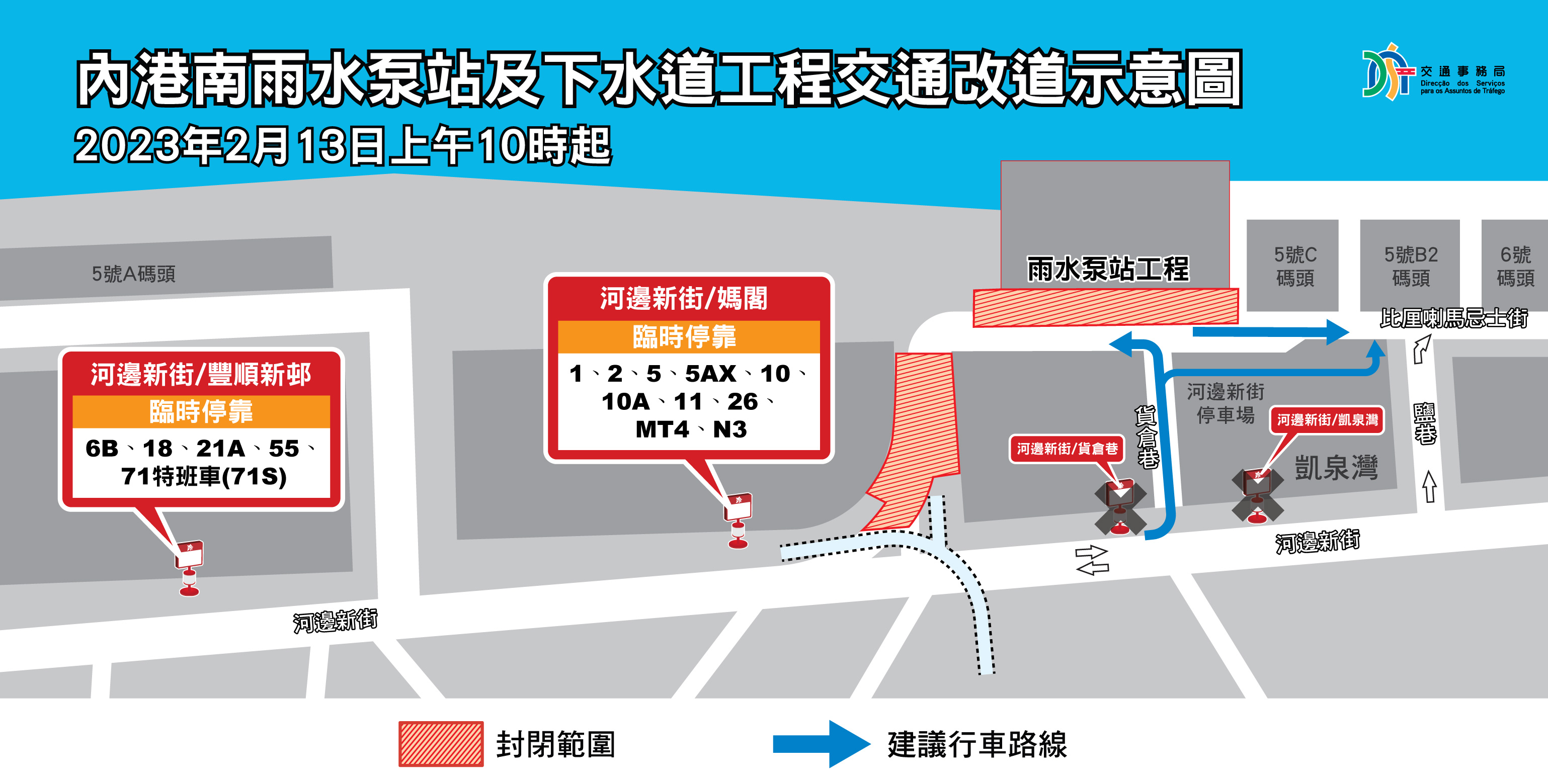 公共建設局已於去年11月底啟動內港南雨水泵站及下水道工程,隨著工程推進,內港一帶道路將分階段封閉及陸續收窄,其中2月13日(周一)上午10時至6月10日,近河邊新街的一段比厘喇馬忌士街實施封閉交通,並臨時停用“河邊新街/貨倉巷”站及“河邊新街/凱泉灣"站,相關路線將改為臨時停靠“河邊新街/媽閣”站或“河邊新街/豐順新邨"站(詳見附表)。為保障工程期間的交通流轉,已降低鹽巷近比厘喇馬忌士街的一段行人路,讓工程開展時,車輛能取道貨倉巷到凱泉灣巴士總站左轉往比厘喇馬忌士街。