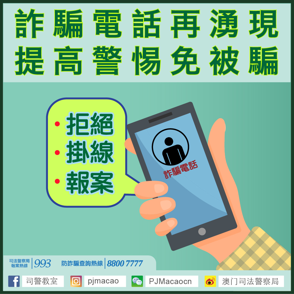 鑑於電話騙案呈高發態勢,司警局再次發出警情通告,強烈呼籲社會各界和大眾警惕各類電話詐騙,並協助警方廣泛轉發防騙資訊。公眾若遇詐騙電話,謹記以下 “拒絕”、“掛線”、“致電”三原則: