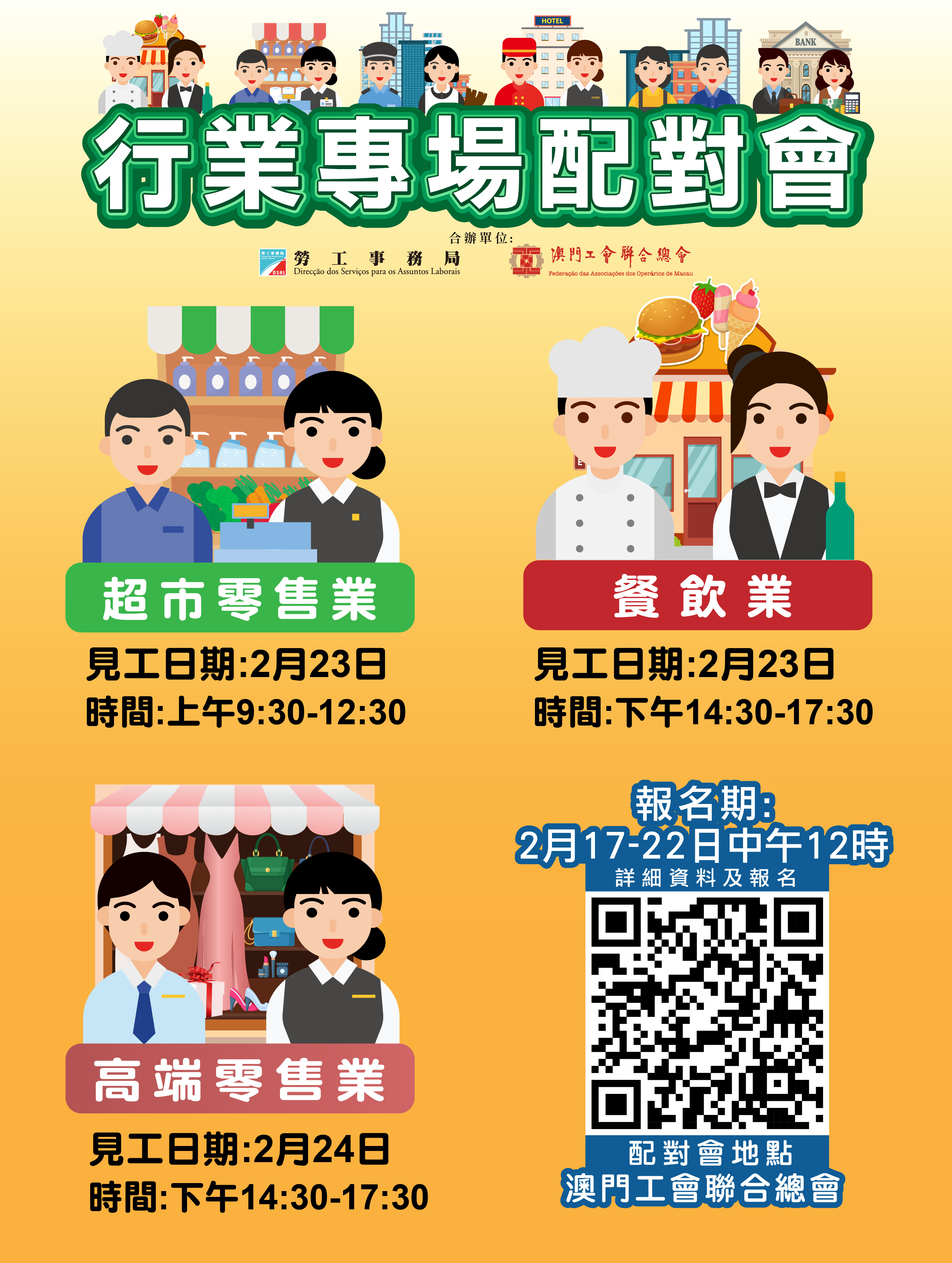 為舒緩業界人資需求壓力,以及為協助有求職需求的澳門居民盡快就業,勞工事務局與澳門工會聯合總會合作,2月23日至24日舉辦3場行業專場配對會,合共提供266個空缺。可由2月17日起至22日中午12時,登入勞工局行業專場配對會專頁(https://www.dsal.gov.mo/zh_tw/standard/indjobfair.html)報名,名額有限,額滿即止。