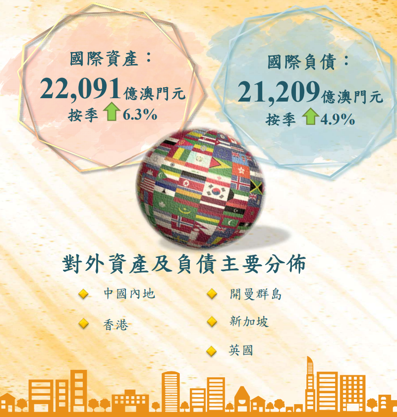 至2022年12月底,澳門銀行的國際資產總額按季上升6.3%,金額為22,091億澳門元(2,751億美元);其中,對外資產按季上升2.5% 至15,989億澳門元,而本地外幣資產增加17.9%,金額為6,102億澳門元。作為國際資產主要組成部分的外地非銀行貸款減少5.4%,金額達7,017億澳門元。