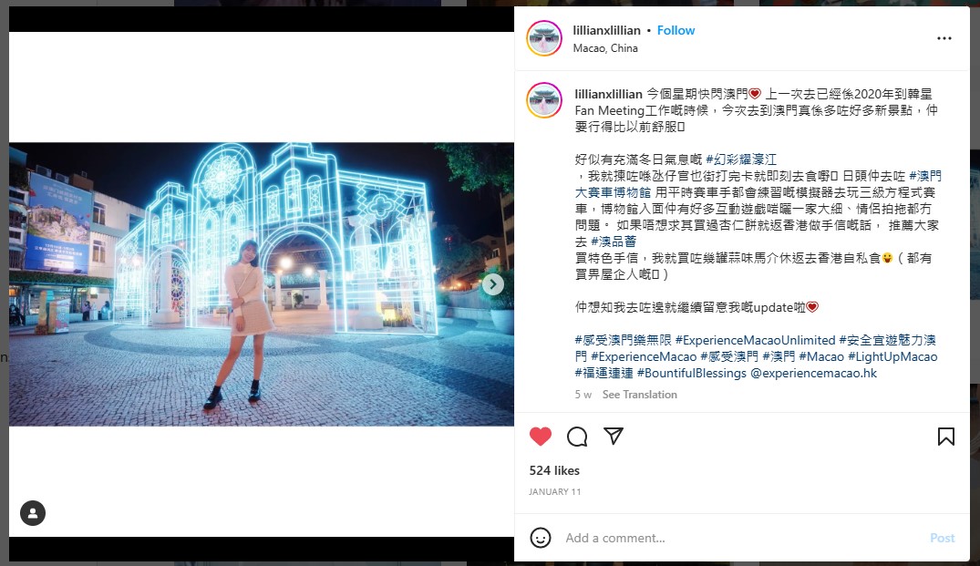 香港網紅的宣傳成效顯著,在城中引起熱話,即時帶動香港居民到澳門旅遊。其中,1月8至9日訪澳的19位香港網紅在社交媒體包括Facebook、Instagram及Youtube合共發佈了290則貼文及限時動態,觸及人數超過270萬(2,704,639),互動人數89,109,瀏覽量接近300萬。