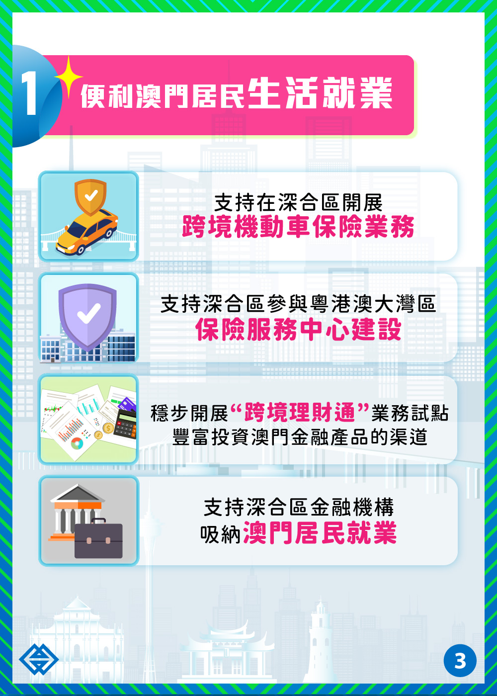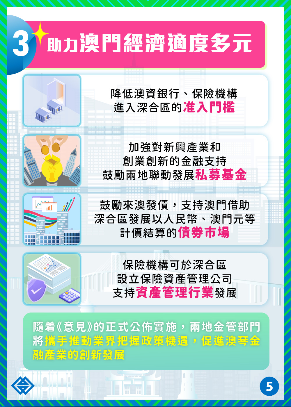 為推動澳門經濟適度多元,特區政府正重點發展現代金融。《意見》提出降低澳資金融機構的准入門檻,並推動不同類型的金融機構在深合區設立,配合澳門發展債券、財富管理及融資租賃等現代金融業務,助力澳門拓大市場空間。