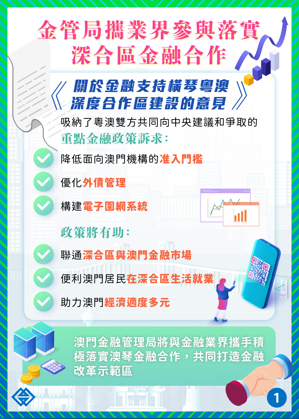 金管局與深合區金融發展局已建立跨境金融工作組,雙方就債券市場、私募基金、融資租賃,以及在深合區建立粵港澳大灣區保險服務中心等議題保持溝通。隨着《意見》的正式公佈實施,兩地金融部門將攜手推動業界用好中央給予的支持政策,促進澳琴金融產業的聯動創新發展。