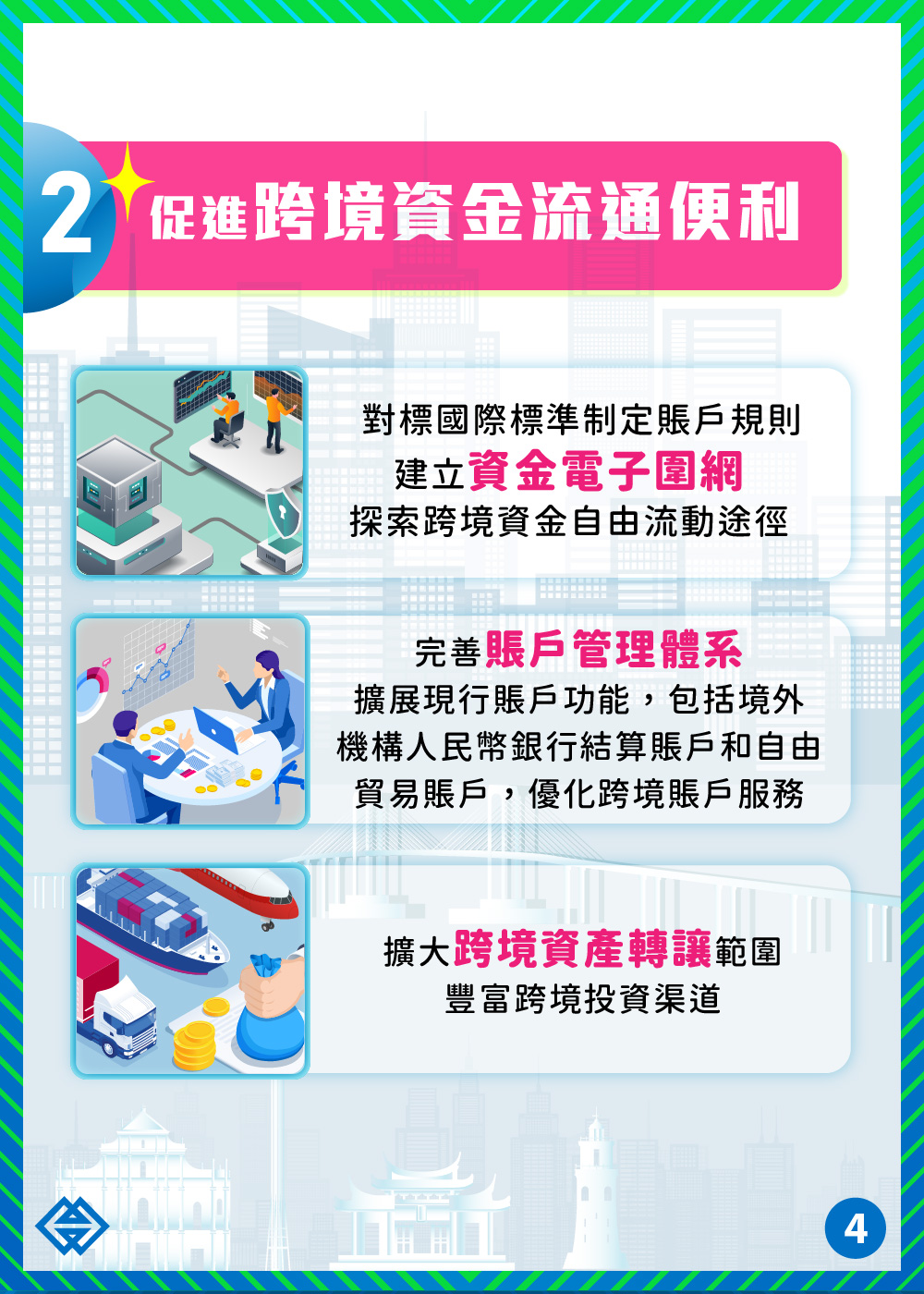 在跨境貿易投融資方面,創新政策重點提出對標國際標準制定賬戶規則,優化改造自由貿易(FT)賬戶建立資金電子圍網系統,並配套制訂跨境資金流動政策。