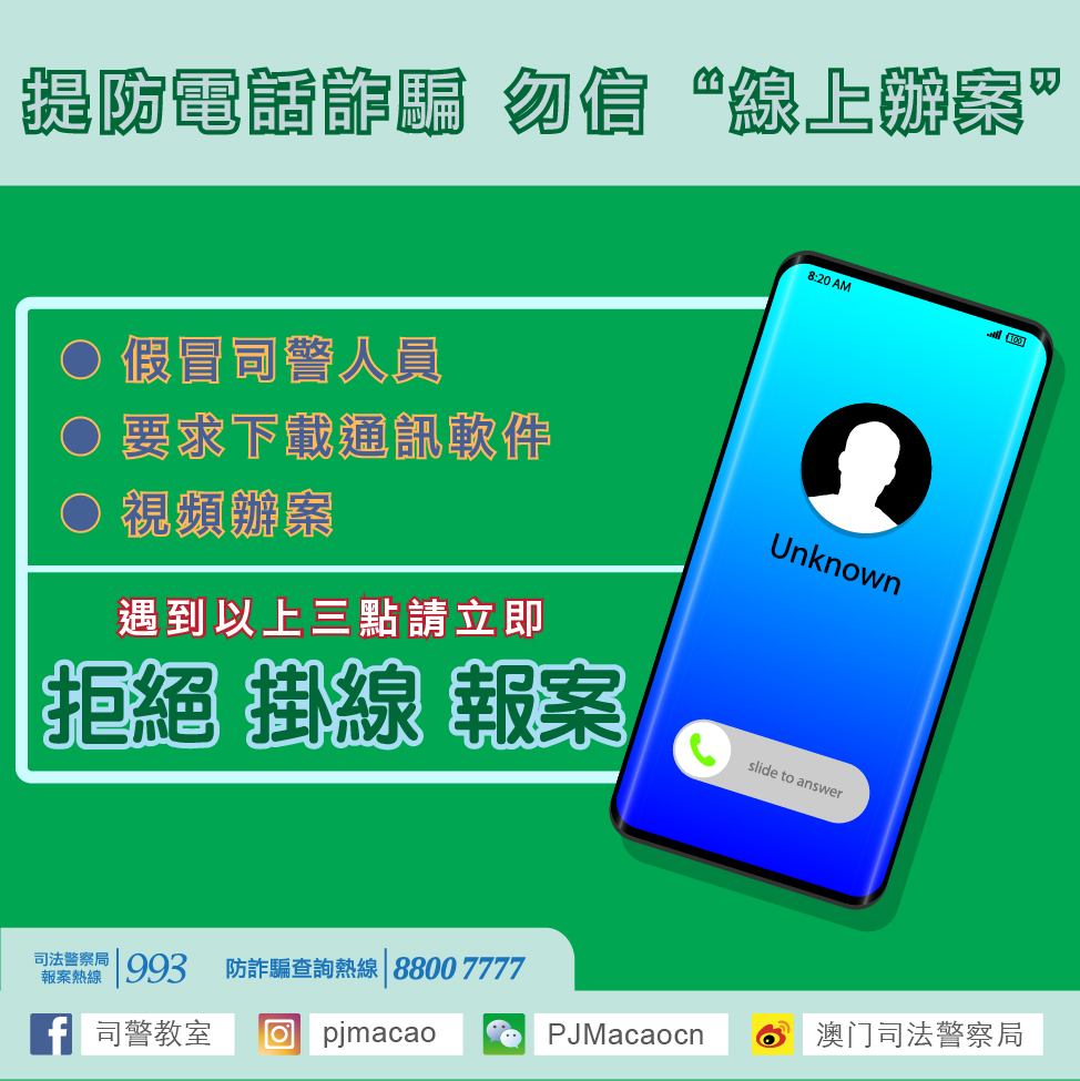 司警局再次強調,警方既不會進行“線上辦案”、“電話辦案”,也不會致電索取個人資料及銀行帳戶資料,更不會將電話轉線至內地執法部門,如遇上述情況,必定是詐騙。近日電話騙案頻發,騙徒經常假冒不同政府機關人員身份進行詐騙,司警局再三呼籲,提防所有陌生來電,警惕各類電信詐騙,如接獲可疑來電,緊記防騙三原則:“拒絕”、“掛線”、“致電”!