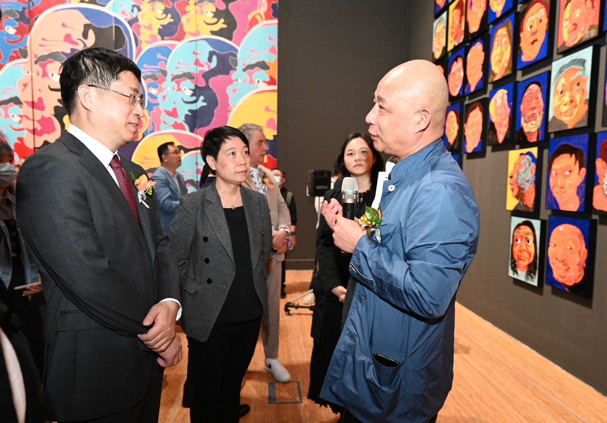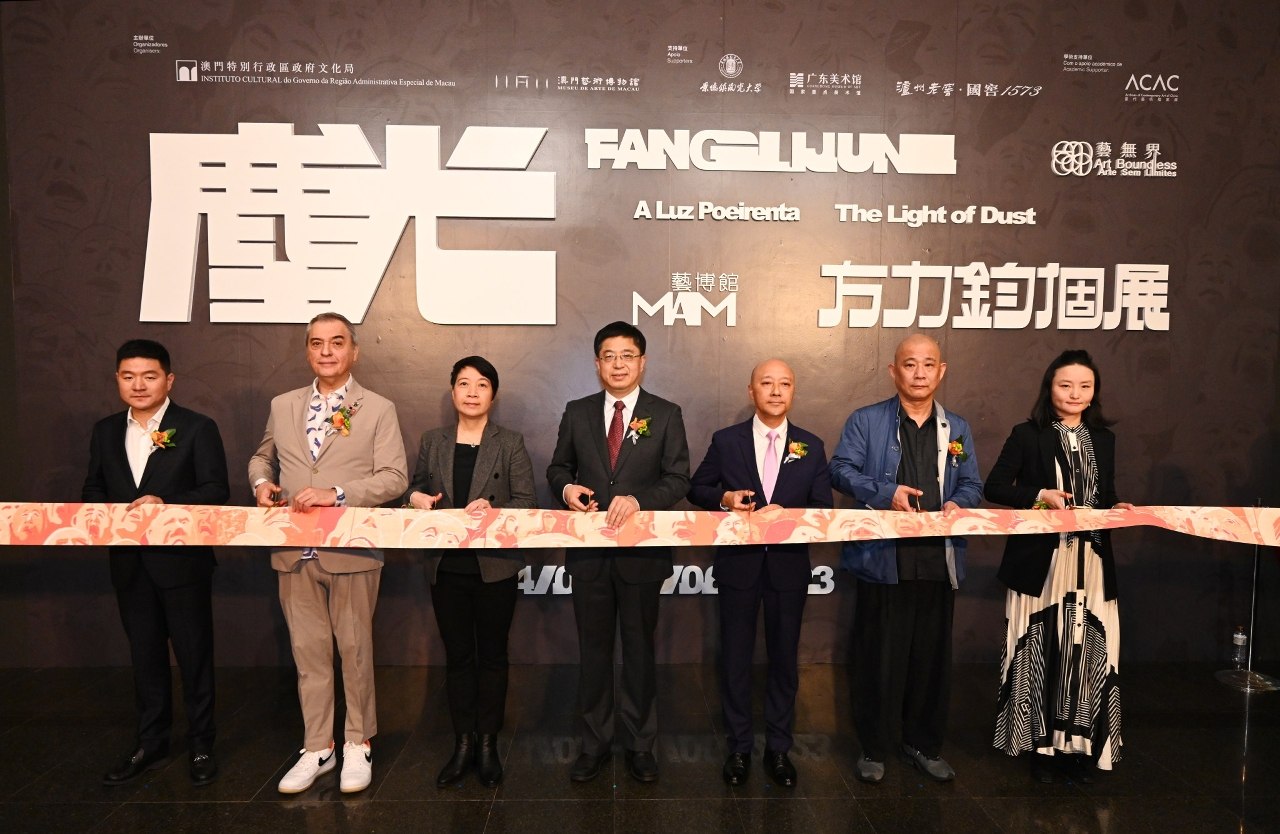 “塵光——方力鈞個展”今日(3月3日)在文化局澳門藝術博物館舉行開幕儀式,中央人民政府駐澳門特別行政區聯絡辦公室宣傳文化部部長萬速成、澳門特別行政區政府文化局局長梁惠敏、澳門美術協會會長陸曦、澳門文化體‧現代畫會會長馬若龍、展覽藝術家方力鈞、瀘州老窖銷售有限公司黨委書記、總經理張彪及策展人羅怡等出席主禮,場面熱鬧。
