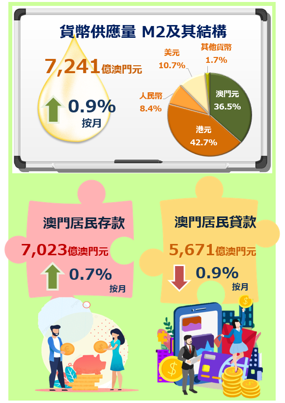流通貨幣及活期存款分別上升6.7%及4.7%,M1因而較上月增加5.2%。與此同時,準貨幣負債上升0.4%,因此包括M1及準貨幣負債的廣義貨幣供應量M2遂按月增加0.9%,金額為7,241億澳門元。若與2022年同期比較,M1下跌2.2%,M2則上升4.6%。按幣種分析,澳門元、港元、人民幣及美元在M2的比重分別為36.5%、42.7%、8.4%及10.7%。