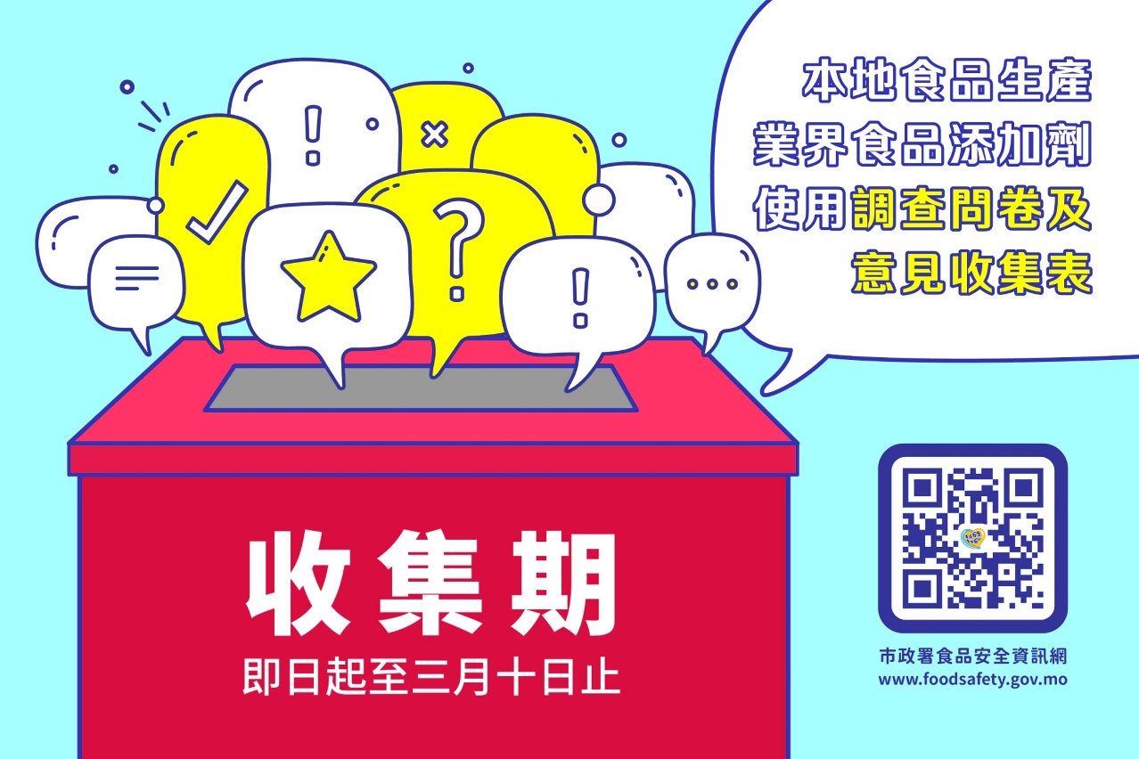 為方便更多食品業界發表意見,市政署已於食品安全資訊網 www.foodsafety.gov.mo 上載《食品添加劑使用調查問卷及意見收集表》,下載及填妥後可電郵至 fsconsult@iam.gov.mo 或傳真至8296 1204提交,亦可致電食安專線2833 8181直接發表意見,收集期將於三月十日結束,歡迎業界踴躍發表意見。