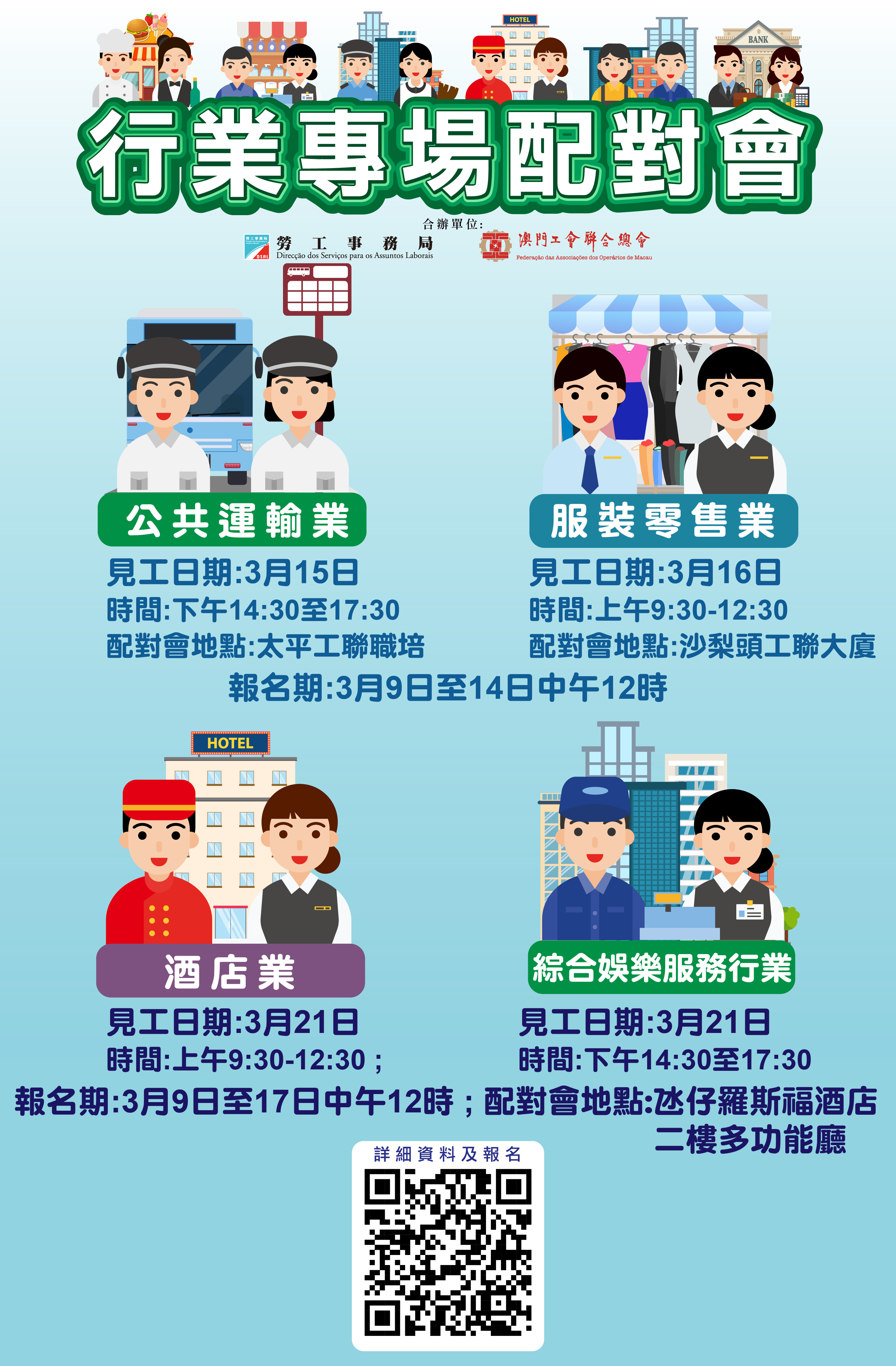 公共運輸業配對會在工聯職業技能培訓中心(工聯職業技能培訓中心)舉行;服裝零售業配對會在澳門工會聯合總會(沙梨頭海邊街2-6號工聯大廈)舉行,上述兩場配對會報名日期為3月9日起至3月14日中午12時;酒店業及綜合娛樂服務行業配對會在氹仔羅斯福酒店二樓多功能廳舉行,報名日期為3月9日起至3月17日中午12時。