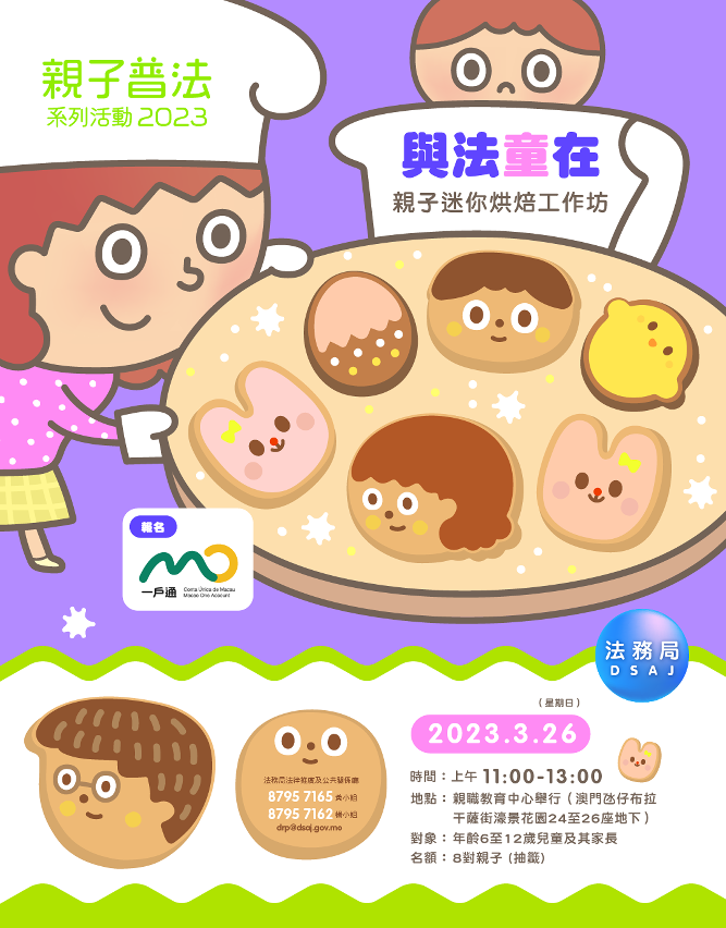 法務局將於本年3月26日舉辦“2023親子普法系列活動”之與法“童”在—親子迷你烘焙工作坊,並由即日起接受報名。