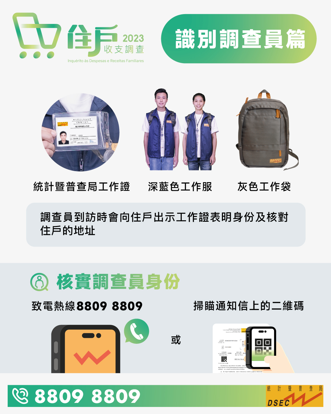 有關2023住戶收支調查的詳情,請瀏覽2023住戶收支調查專頁(https://www.dsec.gov.mo/IDRF2023),或致電熱線8809 8809查詢。