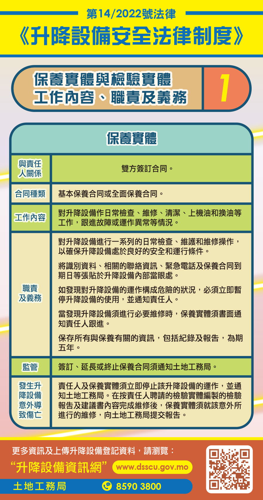 升降設備的安全關係到千家萬戶,因此對相關設備作定期保養及檢驗至關重要。第14/2022號法律《升降設備安全法律制度》透過制度化及規範化管理,令升降設備的使用更有安全保障,包括明確由合資格的保養實體負責對升降設備作恆常的維修保養,並由專業檢驗實體作每年一次定期檢驗等工作。