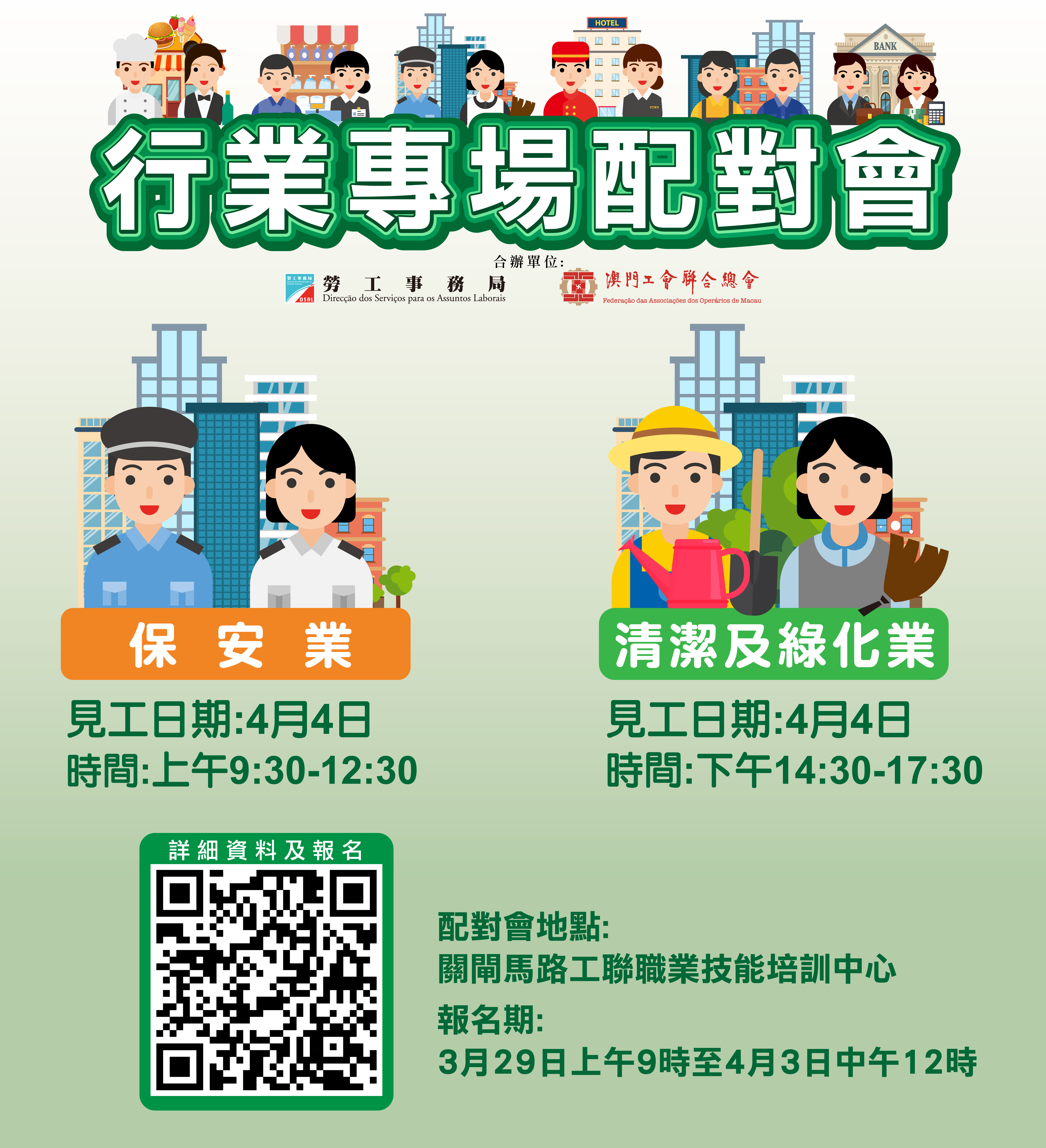 上述保安業配對會及清潔及綠化業配對會均在澳門工聯職業技能培訓中心(關閘馬路101-105A號太平工業大廈第一期1樓)舉行,報名日期為3月29日起至4月3日中午12時。