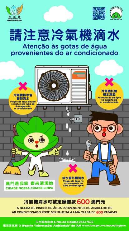 市政署亦持續向社區加強宣傳,透過不同途徑,如張貼海報、派發單張、安裝燈箱廣告及宣傳橫額、邀請本澳團體協助宣傳、在電台播放宣傳聲帶等,向市民宣傳“注意冷氣機滴水”的訊息,又計劃於電視台、巴士、的士、樓宇大堂、超市、市政署轄下設施播放宣傳短片,並上載至市政署網頁宣傳,提醒市民注意冷氣機滴水問題,主動作出改善,避免影響他人。