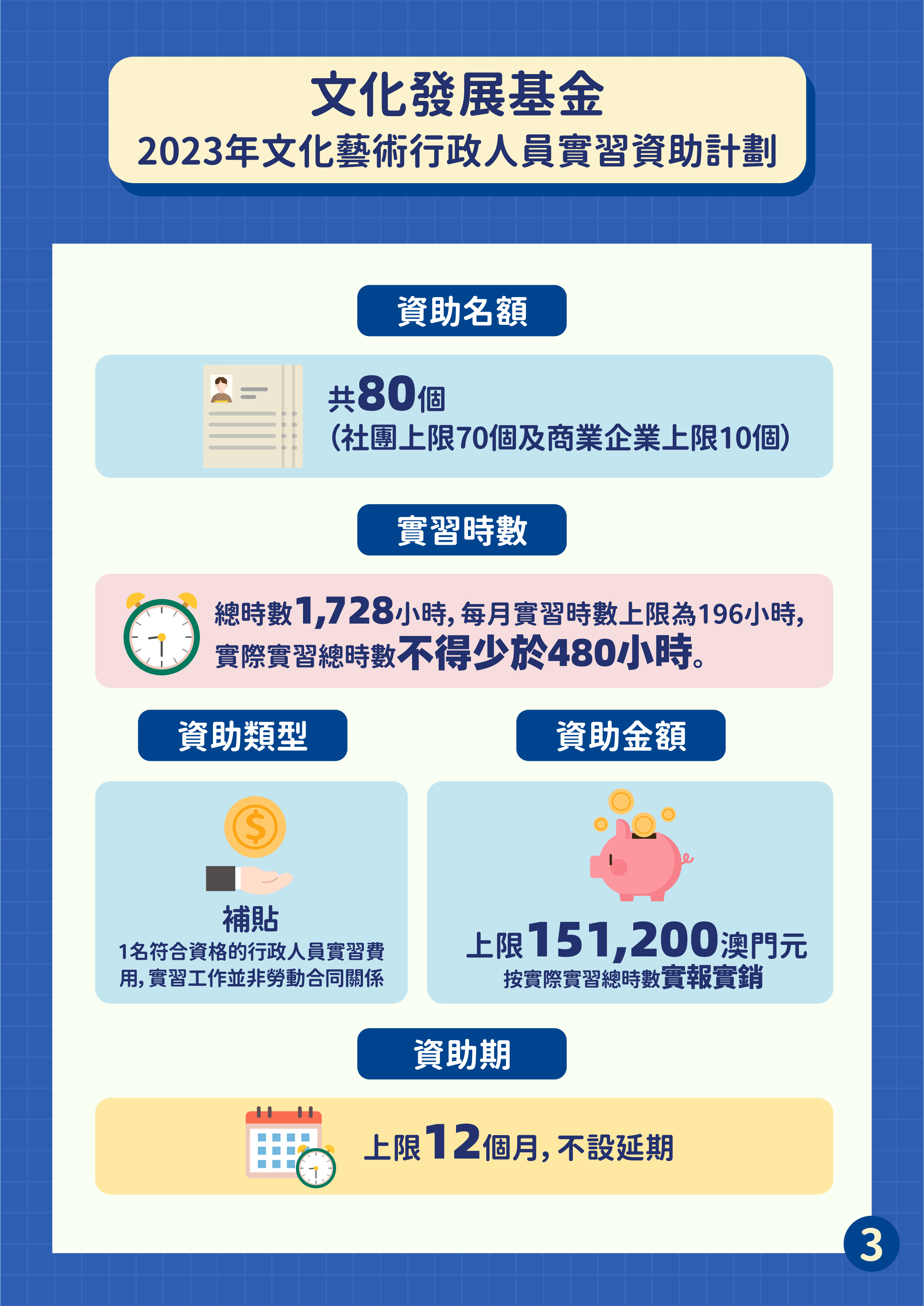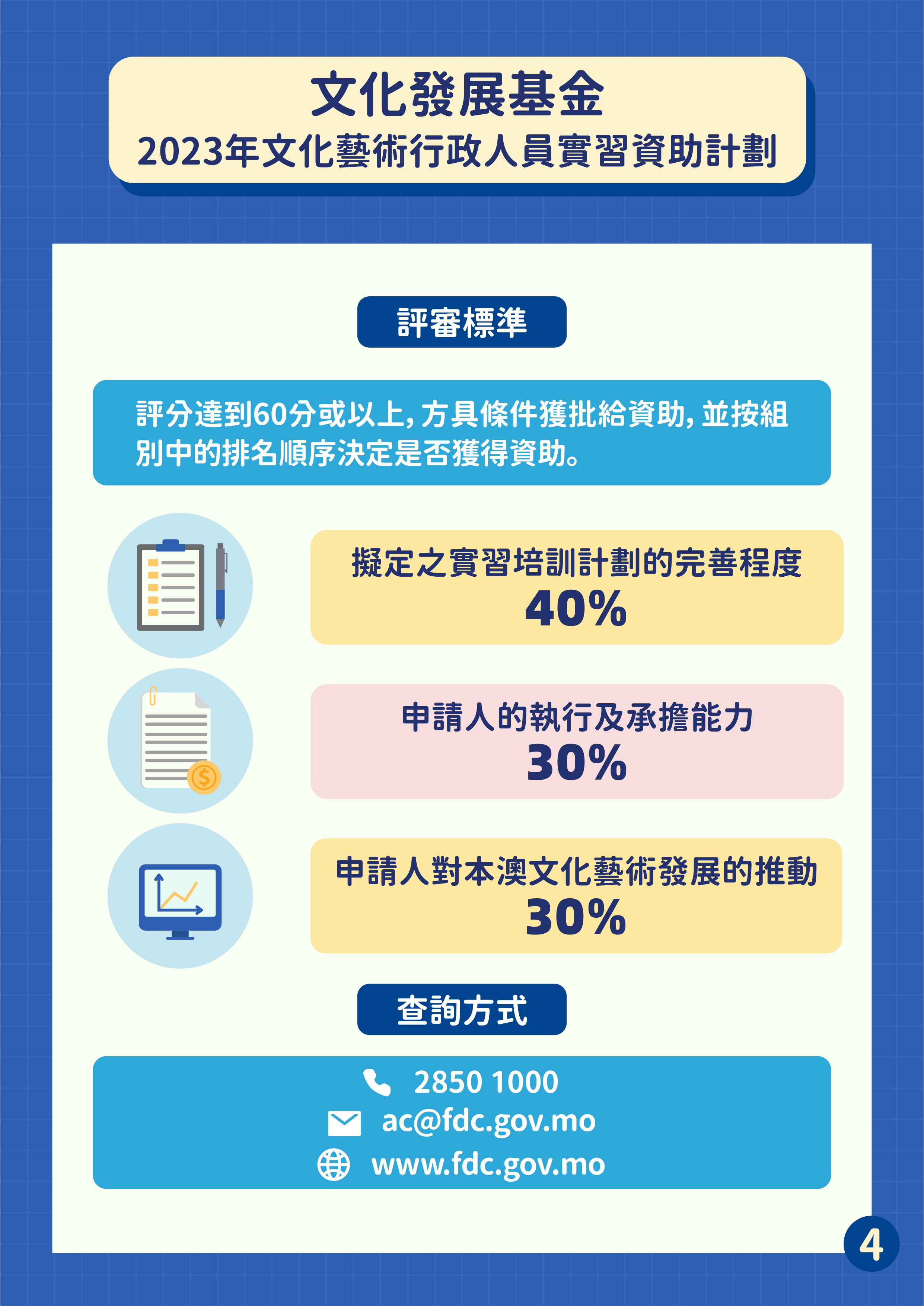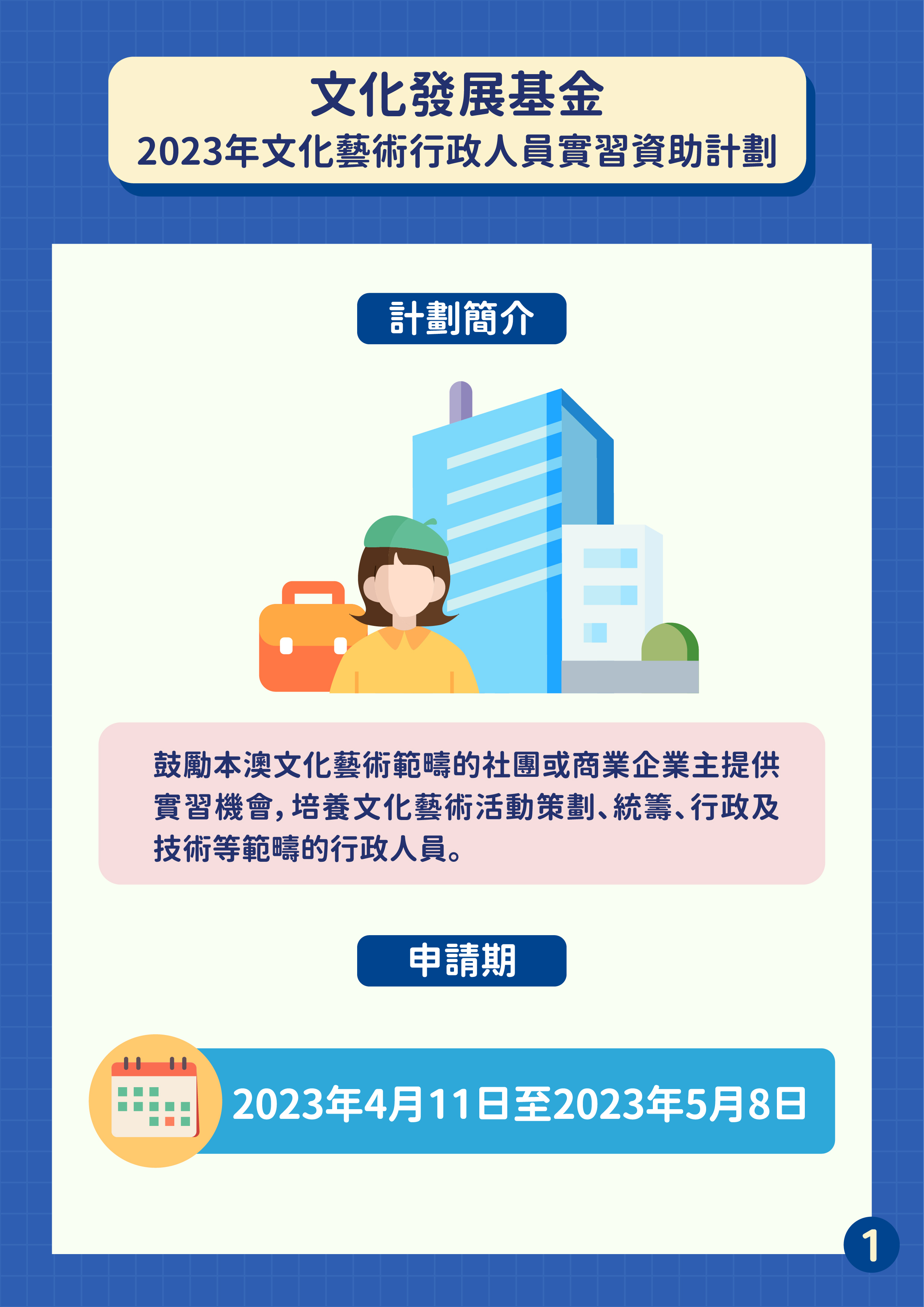 文化發展基金於4月11日至5月8日接受“文化藝術行政人員實習資助計劃”的申請,鼓勵本澳文化藝術社團或商業企業提供實習機會,培養文化藝術活動策劃、統籌、行政及技術等範疇的行政人員。本項計劃是以補貼形式資助經由申請人推薦的1名澳門永久性居民行政人員的實習費用。資助名額80個,包括社團組別上限70個及商業企業組別上限10個。