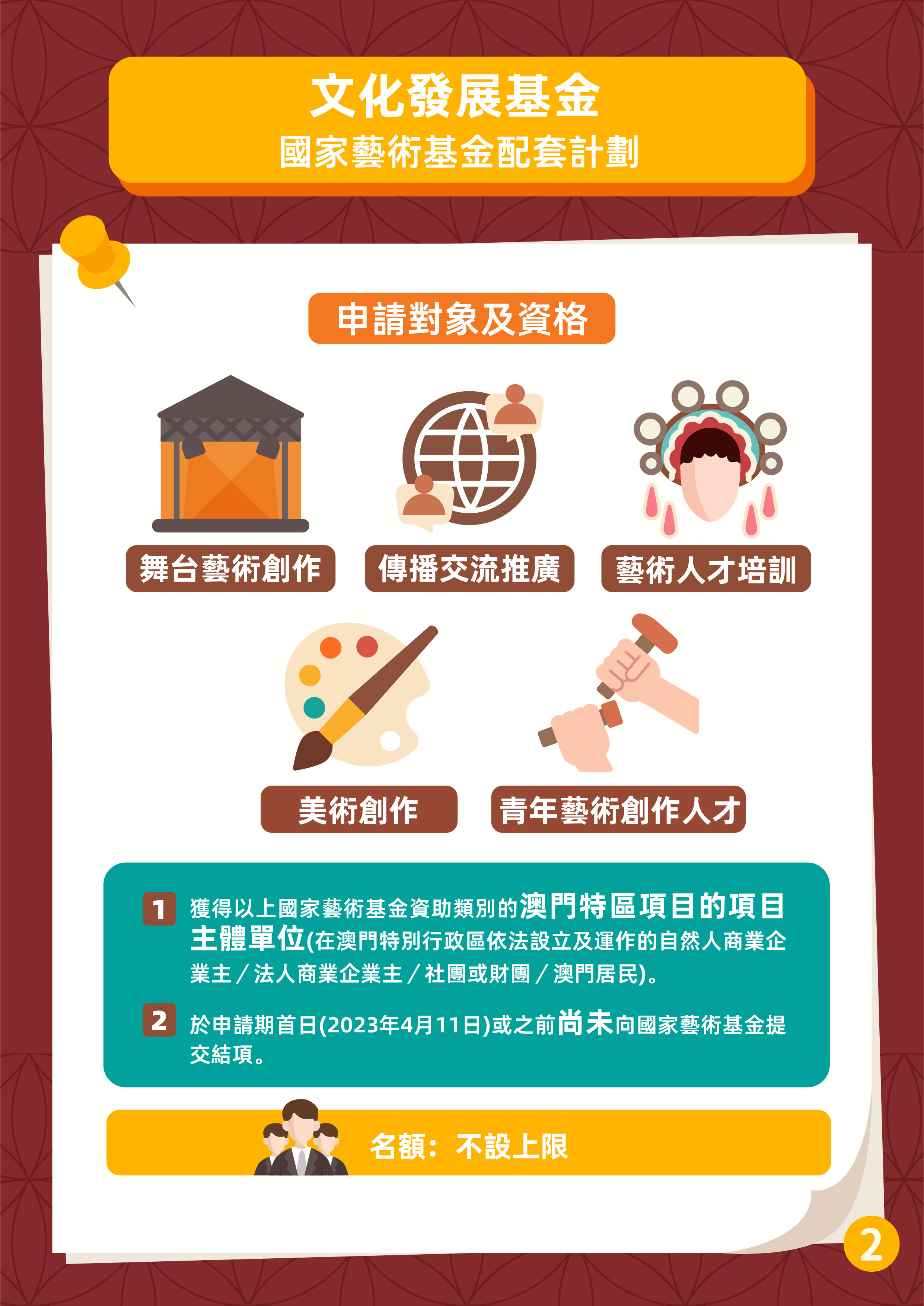 為支持獲得國家藝術基金資助的澳門文化藝術項目落實執行及鼓勵澳門藝術機構和藝術工作者積極申報國家藝術基金,文化發展基金推出“國家藝術基金配套計劃”,申請期由4月11日至5月31日,接受本項計劃申請期首日開始時(即2023年4月11日)尚未向國家藝術基金提交結項的澳門特區項目的申請。配套計劃為補貼形式,不限名額。