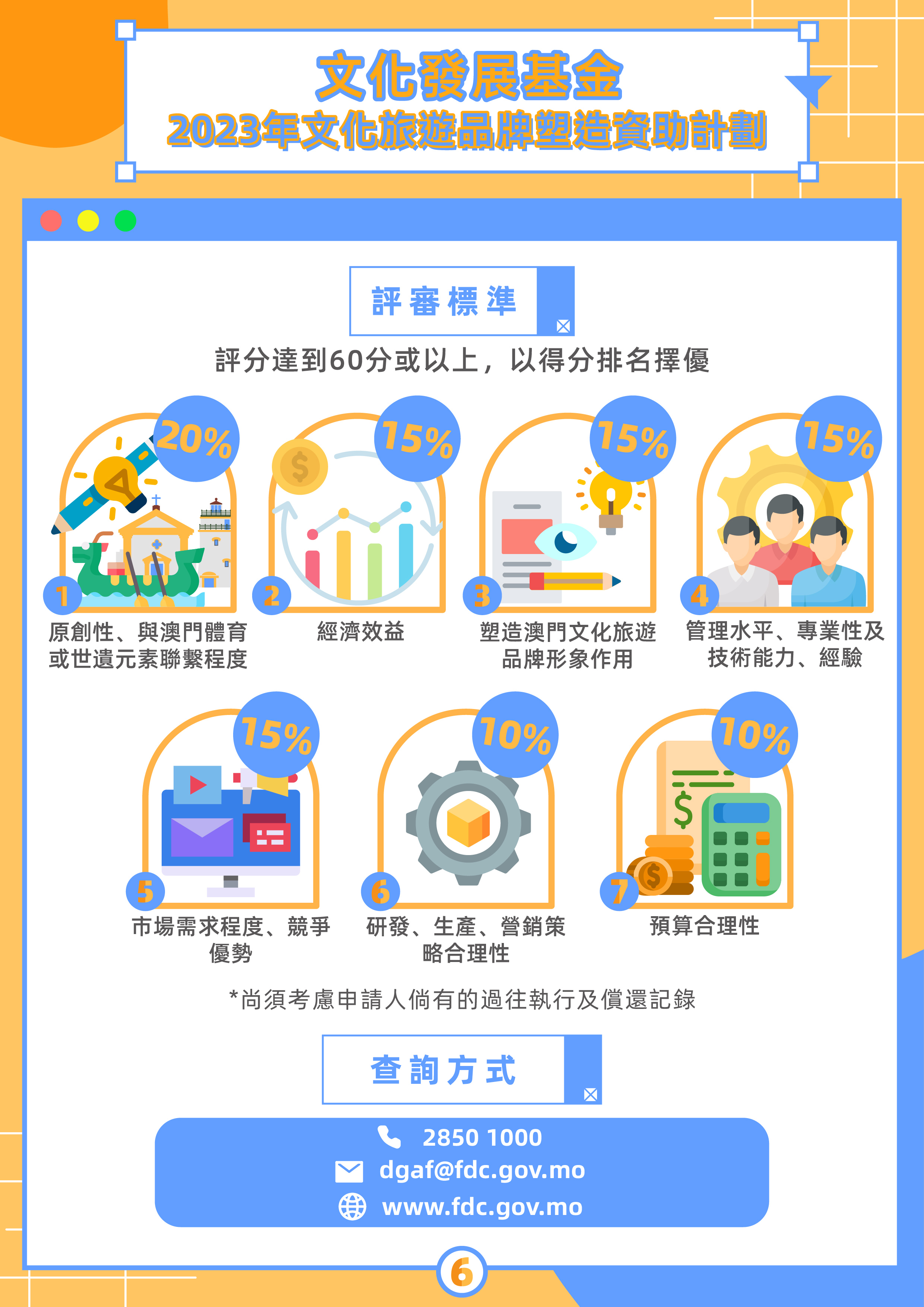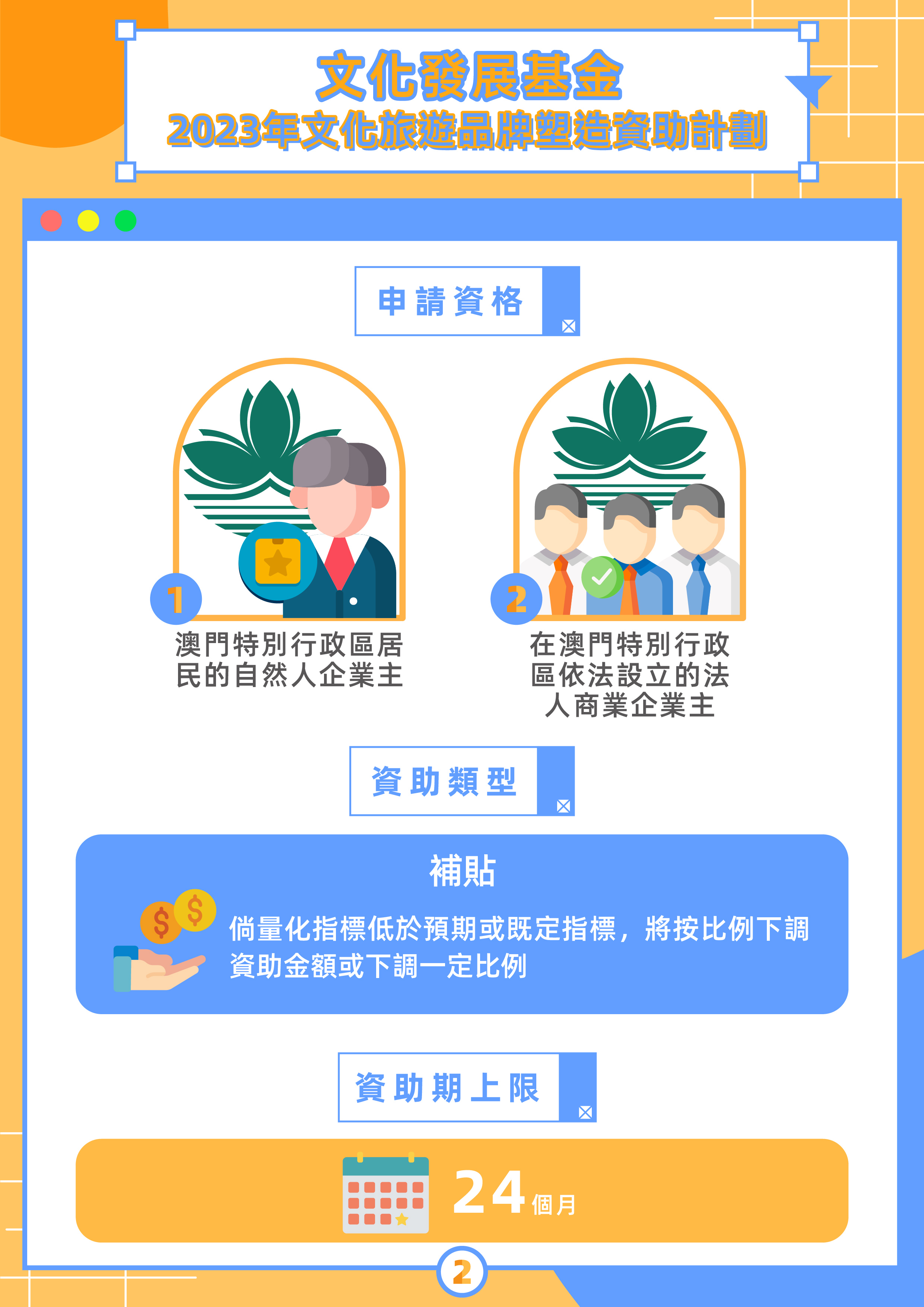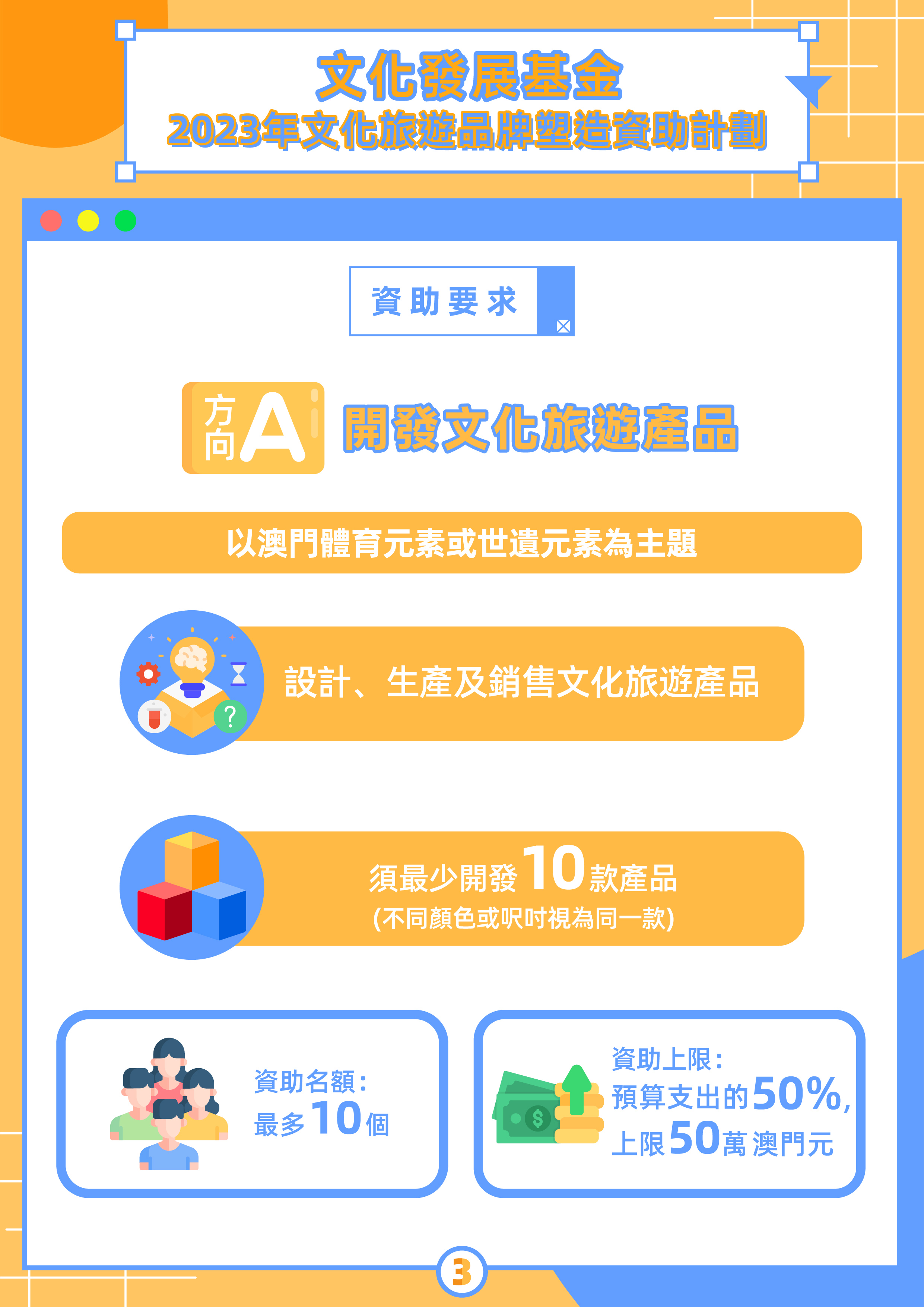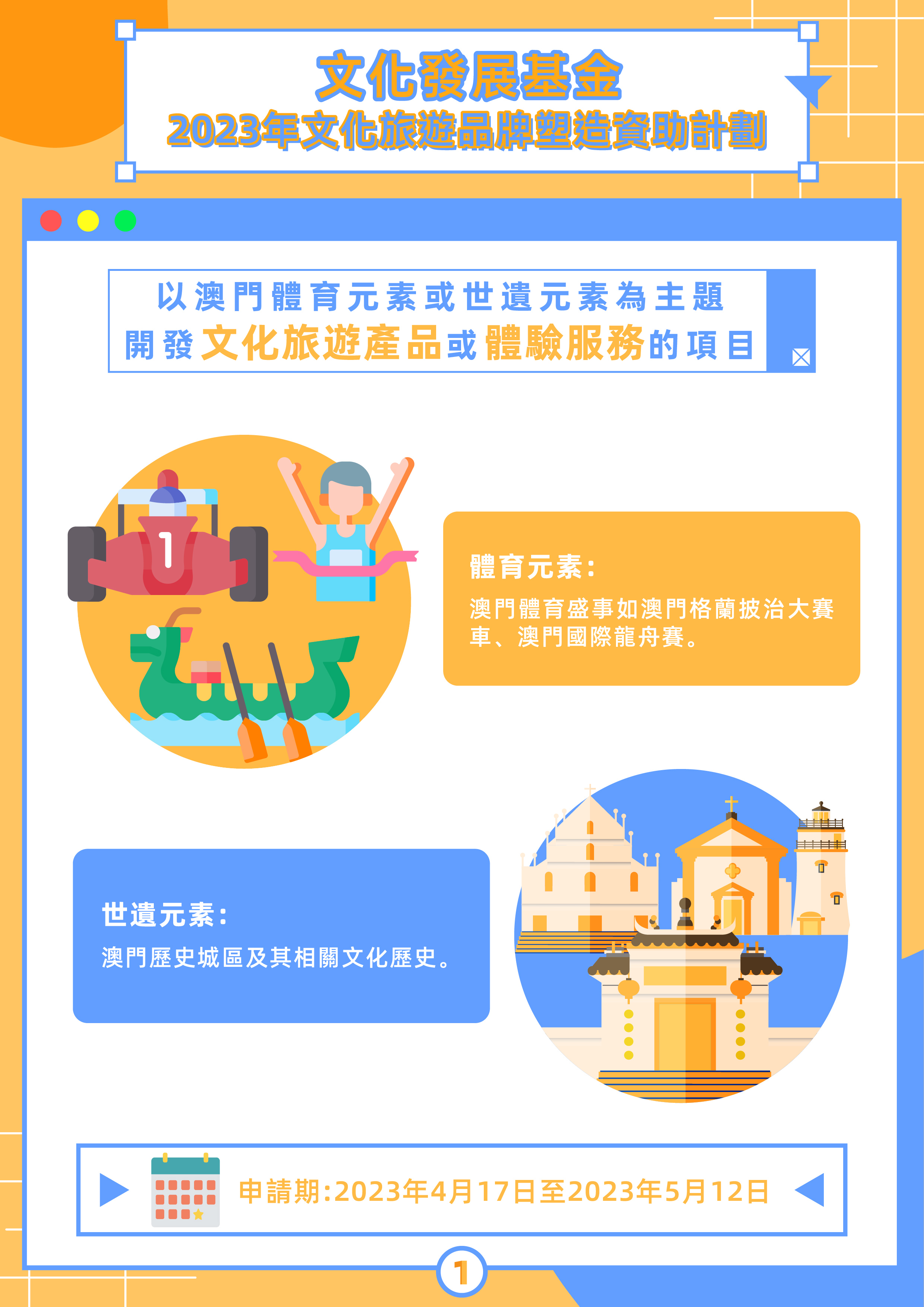 為推動文創與文化旅遊的跨界融合發展,基金將於4月17日至5月12日期間接受2023年“文化旅遊品牌塑造資助計劃”申請。資助計劃分為“開發文化旅遊產品”及“開發文化旅遊體驗服務”兩個方向,申請人須選定其中一個方向,以澳門的體育或世遺任一元素作為主題進行項目開發。資助計劃為補貼形式,名額方面,“開發文化旅遊產品”最多10個,“開發文化旅遊體驗服務”最多4個。