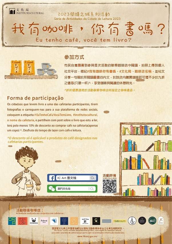 今年圖書館周進一步擴展規模,透過舉辦多項社區推廣活動,讓閱讀走進社區,成為生活的日常風景。4月21日至5月6日期間,將於城市多個地點設置Pop-up Library圖書架,供市民免費取閱圖書,書架隨機現身不同街區角落,市民可透過圖書館在社交媒體發佈的提示,如尋寶般追蹤書架下落,尋覓好書;“悅讀趴趴走”將在4月15、16、22、23日(星期六及日)於多個戶外場所,如大三巴牌坊前地、玫瑰聖母堂前地、益隆炮竹廠舊址遊徑、三盞燈圓形地、祐漢街市公園等舉行多場閱讀快閃活動,以文學結合音樂,形體和說故事的演譯方式,帶來全新互動閱讀體驗;“我有咖啡,你有書嗎?”活動將於4月15至30日期間聯乘本澳多間精品咖啡店,鼓勵市民自攜圖書到聯乘咖啡店中閱讀,並於新媒體平台分享閱讀,享受咖啡與書香結合的休憩時光。