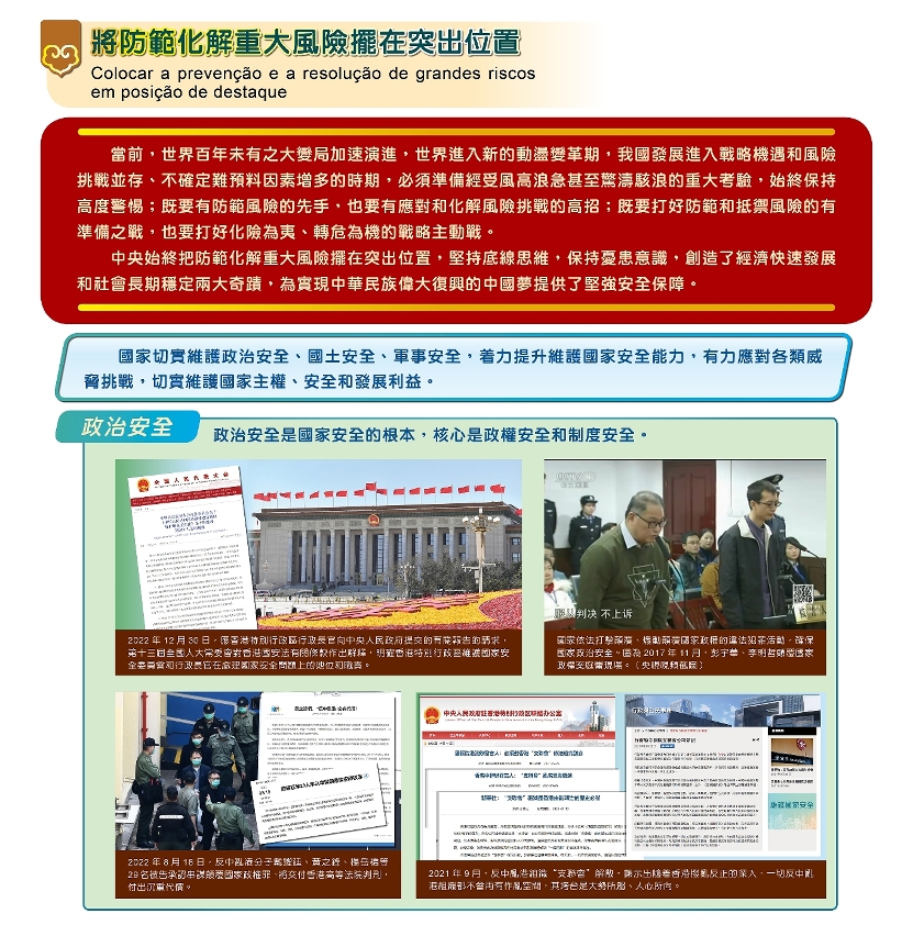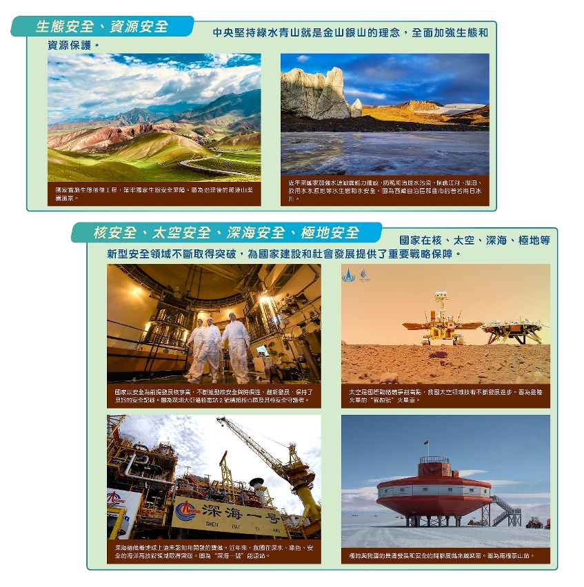 第二部分展示的內容包括:面對嚴峻複雜的國家安全形勢,中央始終把防範化解重大風險擺在突出位置,致力維護傳統安全、非傳統安全,以及新型安全領域,着力提升維護國家安全能力,有力應對各類威脅挑戰,切實維護國家主權、安全和發展利益等。