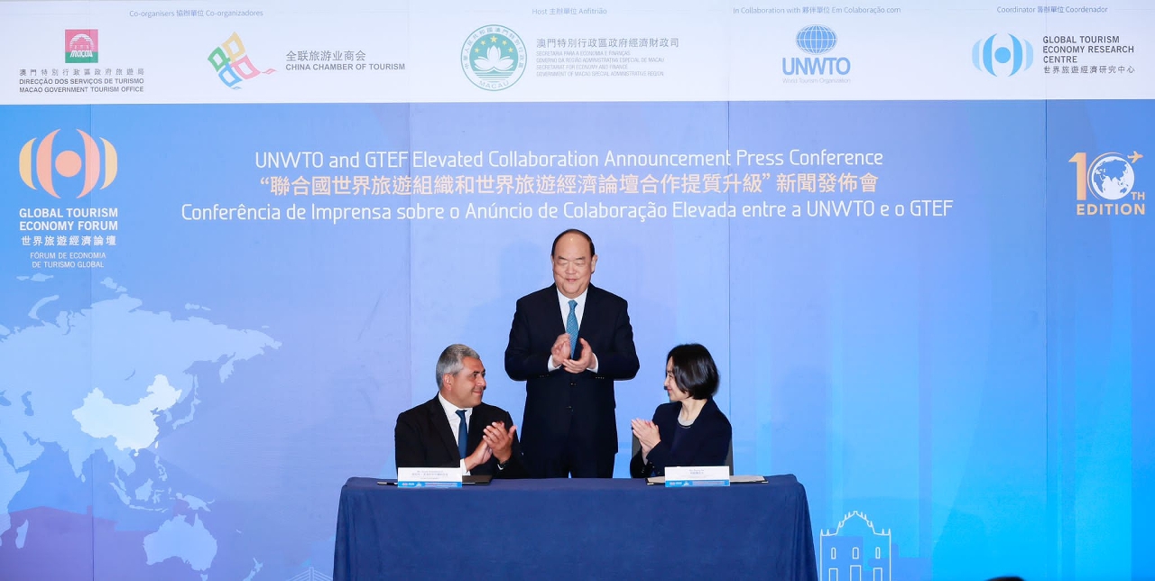 “聯合國世界旅遊組織和世界旅遊經濟論壇合作提質升級”新聞發佈會上,在澳門特別行政區行政長官賀一誠見證下,聯合國世界旅遊組織秘書長祖拉布•波洛利卡什維利和世界旅遊經濟研究中心主席何超瓊代表簽署框架協議,標誌著雙方合作進一步升級。