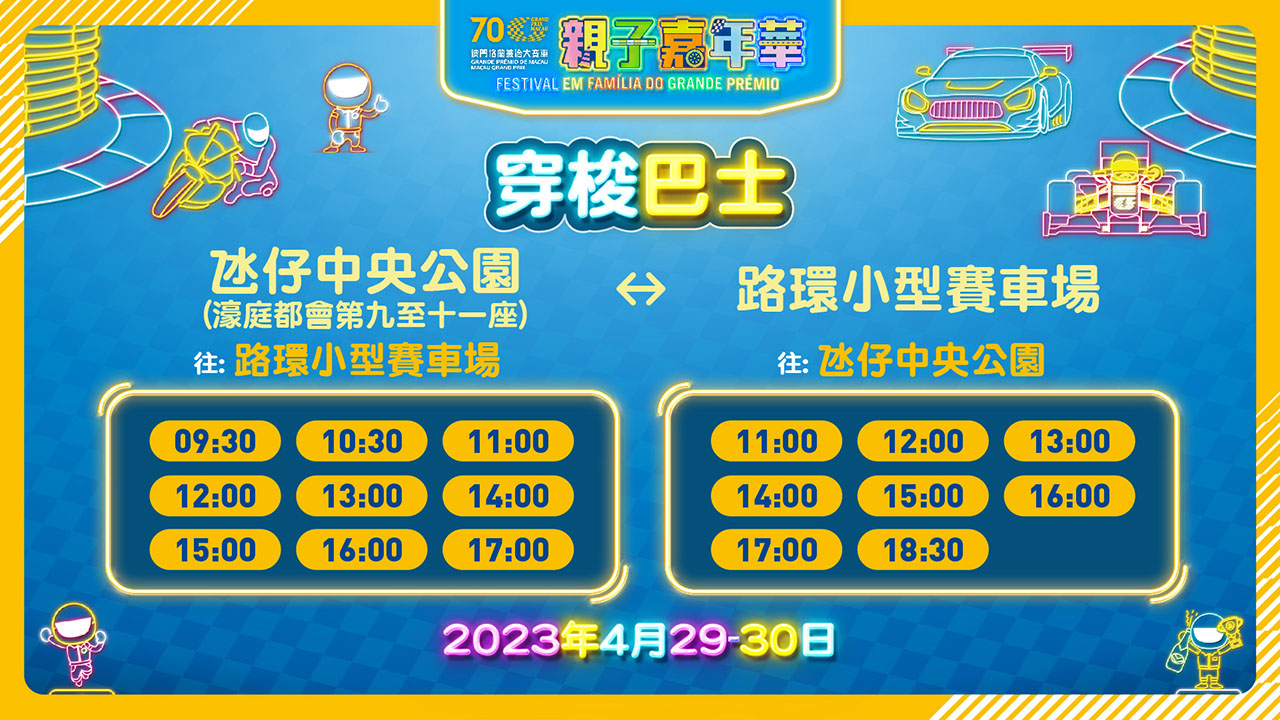 為了方便公眾前往現場參與活動,主辦單位將安排兩條穿梭巴士路線,分別由綜藝館及氹仔中央公園(近濠庭都會第九座至十一座)接載市民及旅客往返路環小型賽車場,首班穿梭巴士發車時間為早上9時30分。