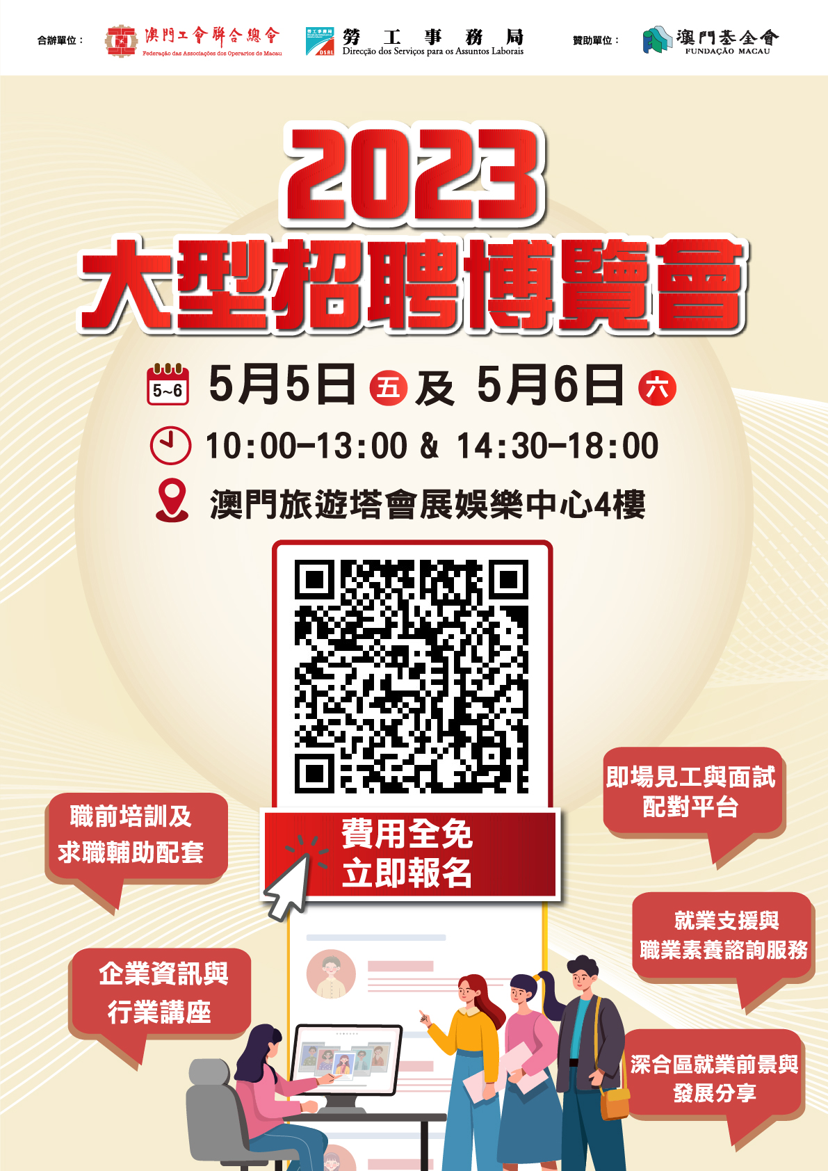 為著力拓寬就業渠道,進一步促進居民就業,勞工事務局與澳門工會聯合總會於5月5日及6日假澳門旅遊塔會展娛樂中心4樓合辦「2023大型招聘博覽會」。有意參加者由即日起至4月28日進行網上預約( https://www.dsal.gov.mo/zh_tw/standard/spring_jobfair_workshop.html )。