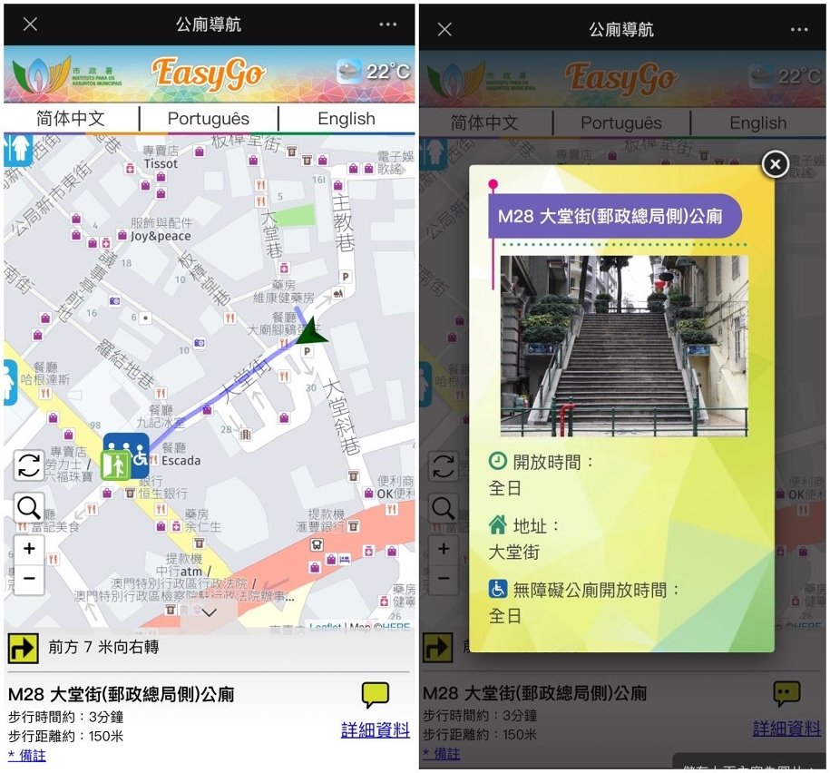 市政署正逐步於全澳各區的公廁指示牌上,增設“EasyGo公廁導航”二維碼。市民或遊客只需用手機掃瞄相關二維碼,便可進入“EasyGo公厠導航”頁面,允許獲取位置就可使用導航功能前往最近的公廁。同時,亦可獲取該公廁的開放時間、具體地址、是否具有無障礙設施等資訊。使用者亦可以儲存二維碼圖片,便可於有需要時使用該功能。市政署將於具條件的地點,逐步增加公廁指示牌及二維碼數量,方便市民及遊客獲取公廁資訊。