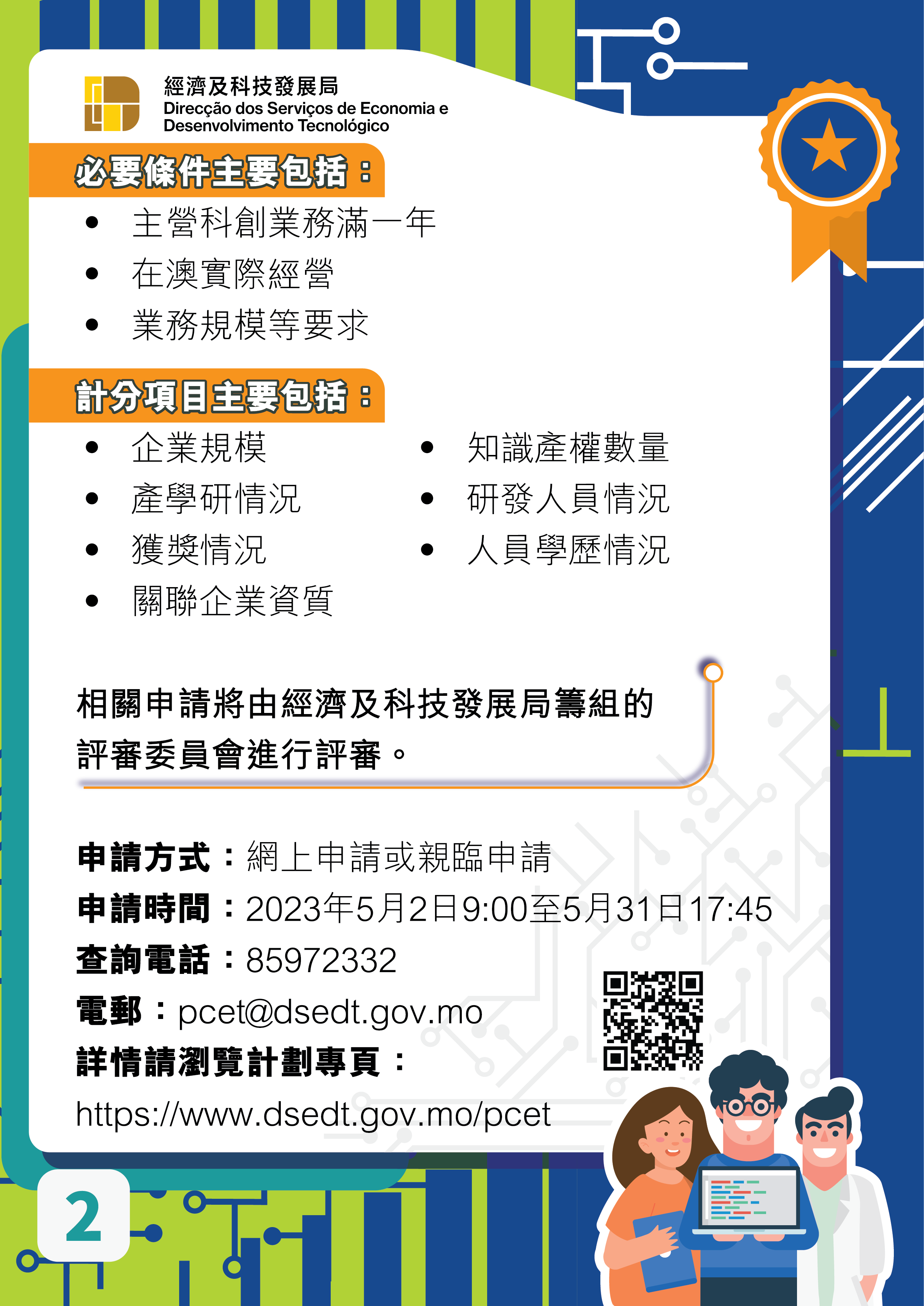 本次計劃申請期為2023年5月2日至31日,申請者可透過經科局網上系統提交申請,詳情可瀏覽計劃專頁(https://www.dsedt.gov.mo/pcet),或致電8597 2332查詢。
