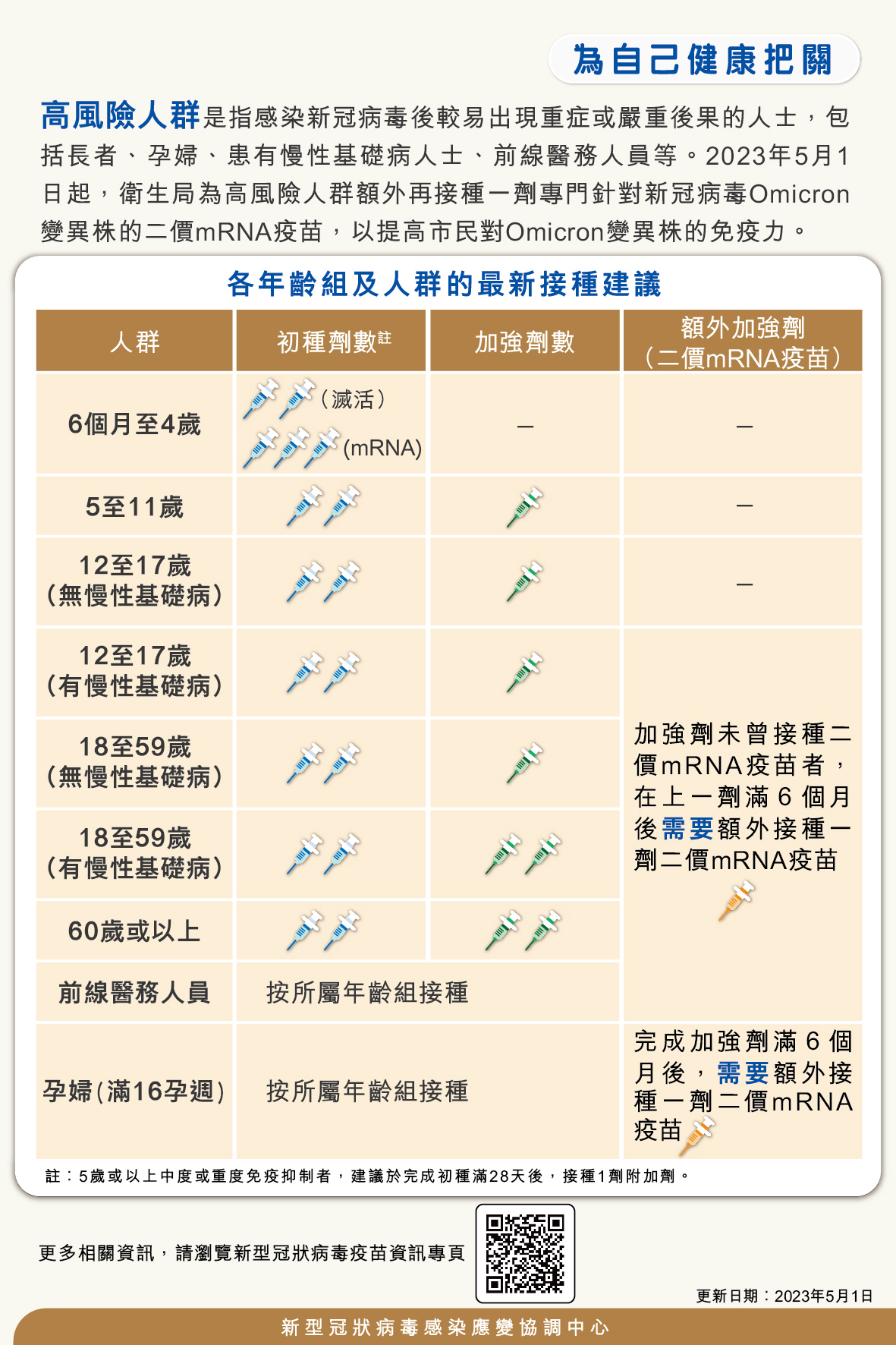 高風險人群指感染新冠病毒後較易出現重症或嚴重後果人士,包括長者、孕婦、患有慢性基礎病人士、前線醫務人員等。各人群及各年齡組的最新接種建議如下: