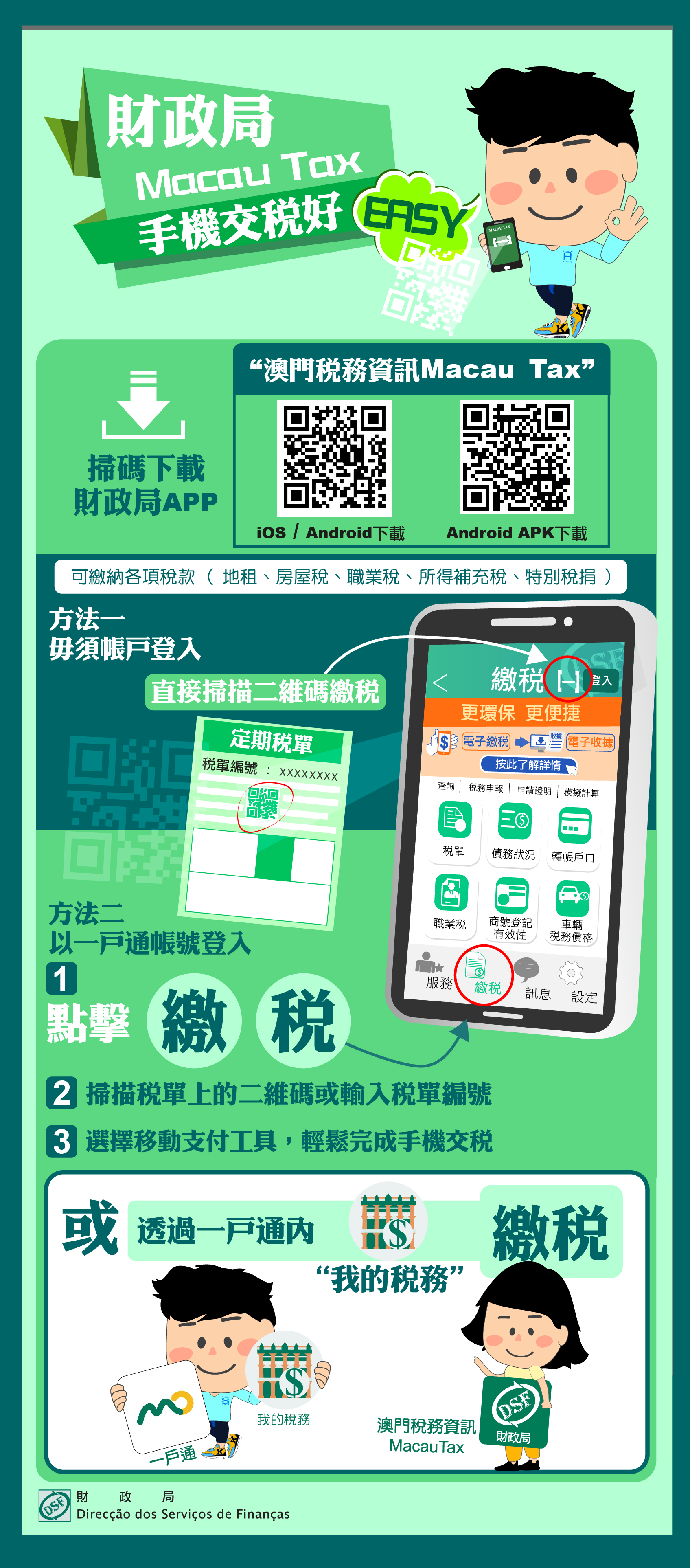 納稅人只需掃描稅單上的繳稅二維碼,或輸入稅單編號,即可透過移動應用程式“澳門稅務資訊Macau Tax”、“一戶通‧我的稅務"繳交稅款,並可查閱繳稅紀錄及下載電子收據,環保省時免排隊,快捷又方便。