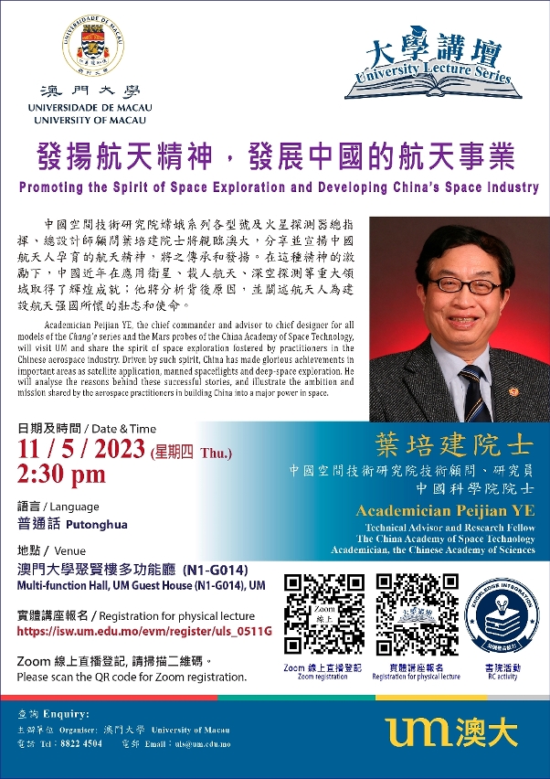澳門大學將於5月11日舉辦“大學講壇”講座,由中國空間技術研究院技術顧問暨研究員、中國科學院院士葉培建擔任講者,就“發揚航天精神,發展中國的航天事業”為題發表演說。講座將線上線下同步舉行,歡迎有興趣人士參加。