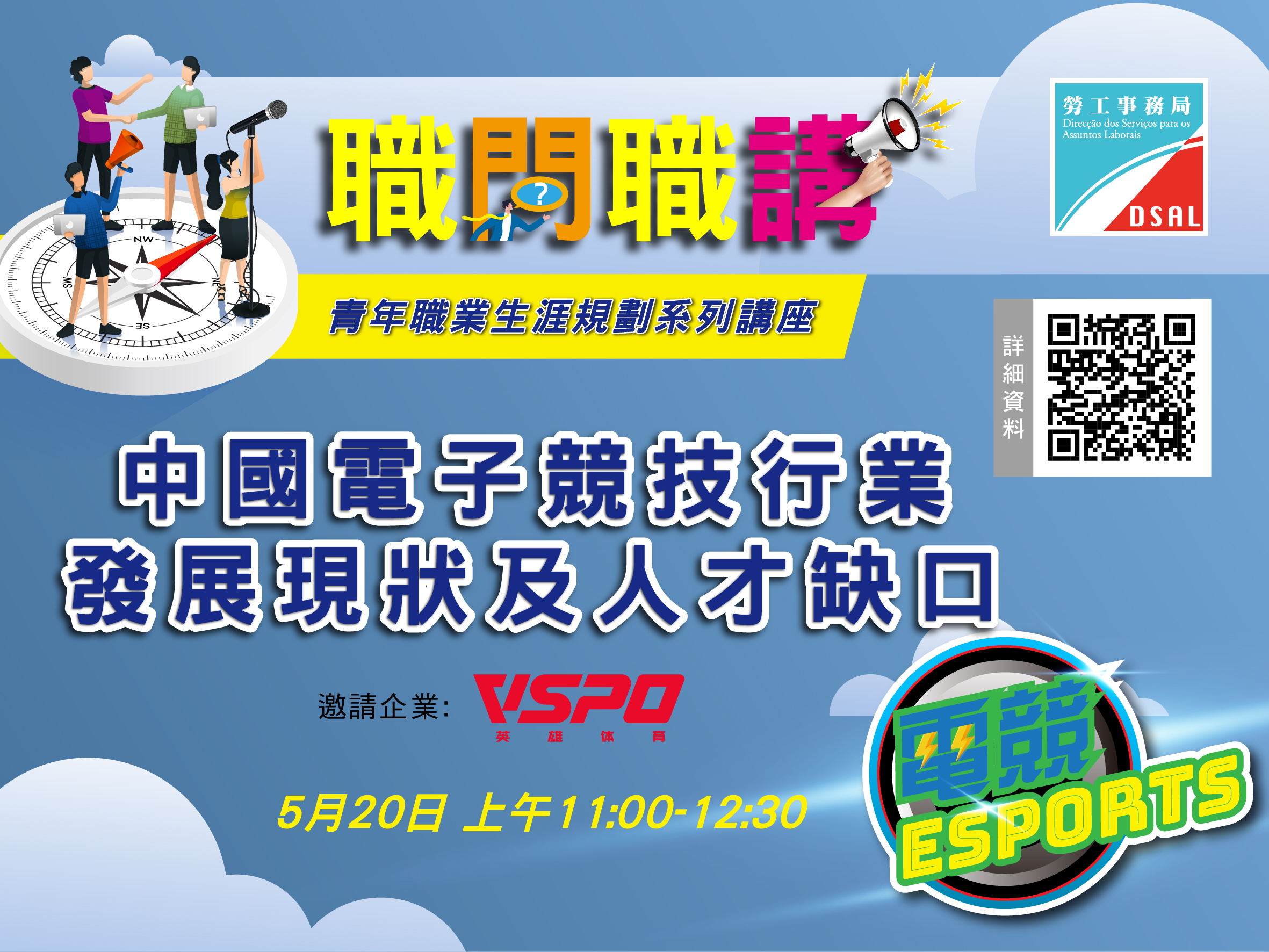 勞工事務局與深合區民生事務局及英雄體育VSPO再度合作,即將推出第二期“澳門青年電子競技産業專項實習計劃”。為讓更多澳門青年認識相關行業,勞工局將於5月20日以線上形式舉辦“職問職講”行業專題講座,並於5月13日起接受網上報名。
