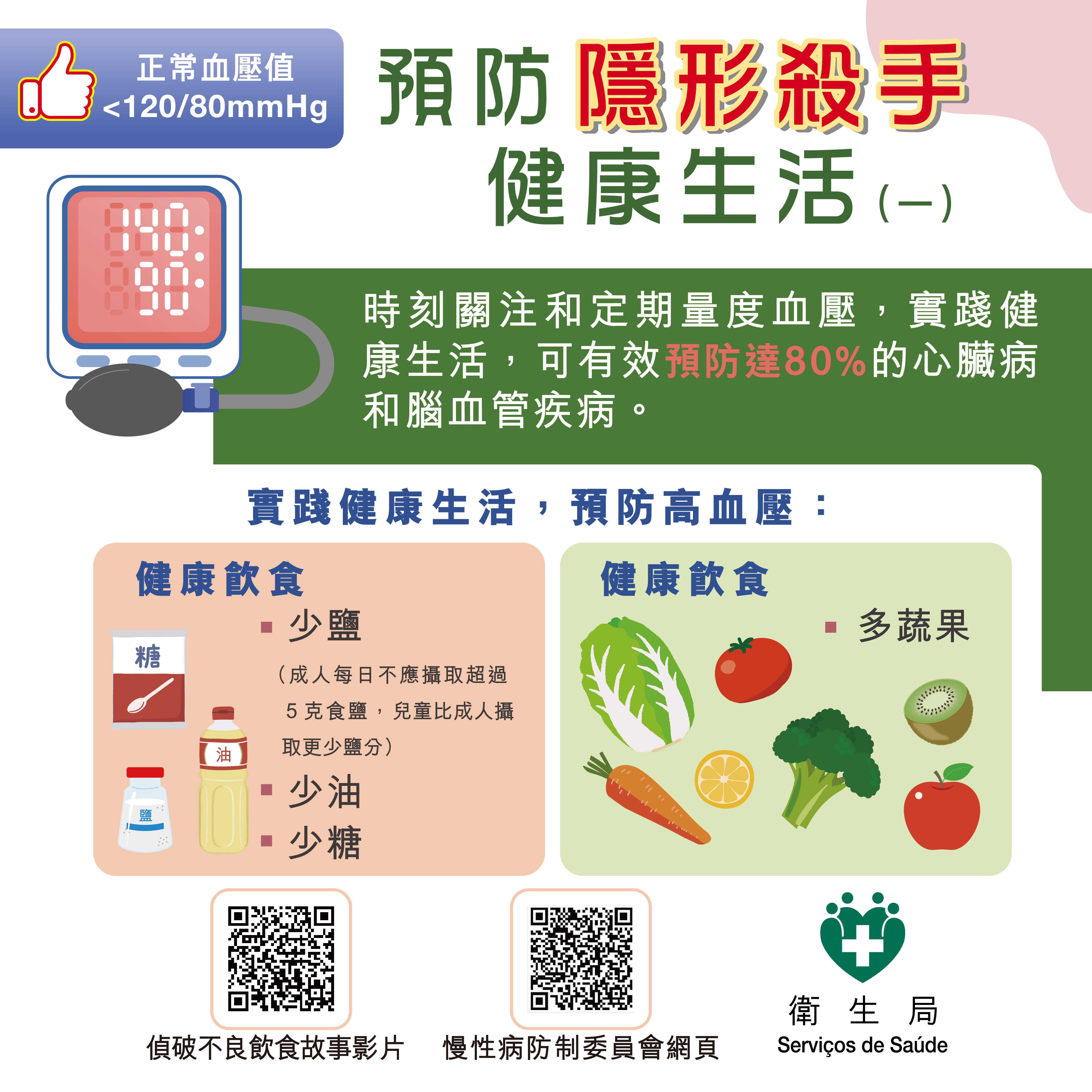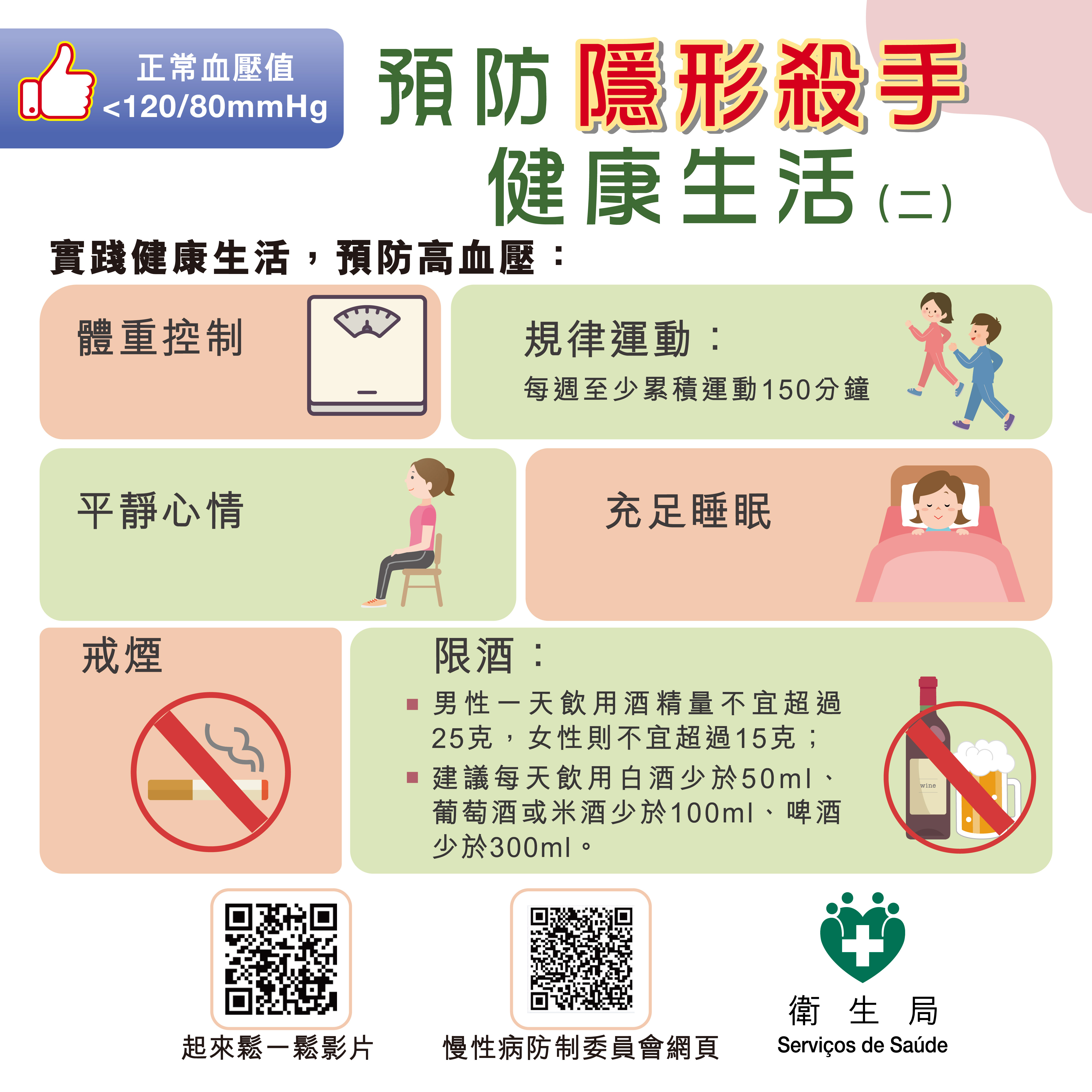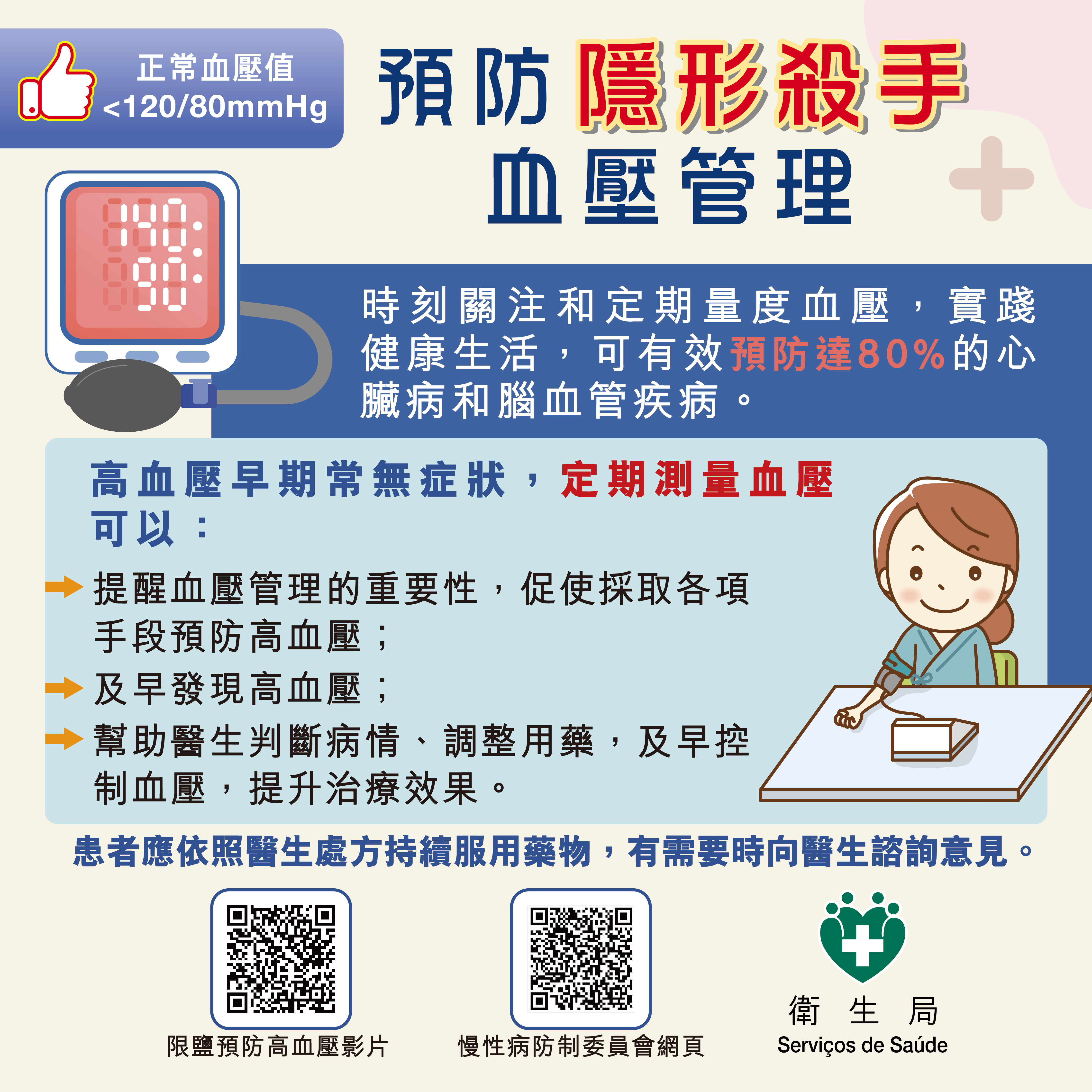 此外,衛生局自2015年起亦推出了“自家健康 自家管理”計劃,現時在本澳社區設立超過30個血壓體重自助檢測站,推動居民透過這些檢測站或在家中自行測量血壓及體重指數,並記錄測量數值,促進其關注和管理自身的健康,以預防和控制高血壓等慢性病。居民可透過“一戶通"手機應用程式,查閱自己在“自家健康 自家管理”計劃檢測站點所測量的記錄。