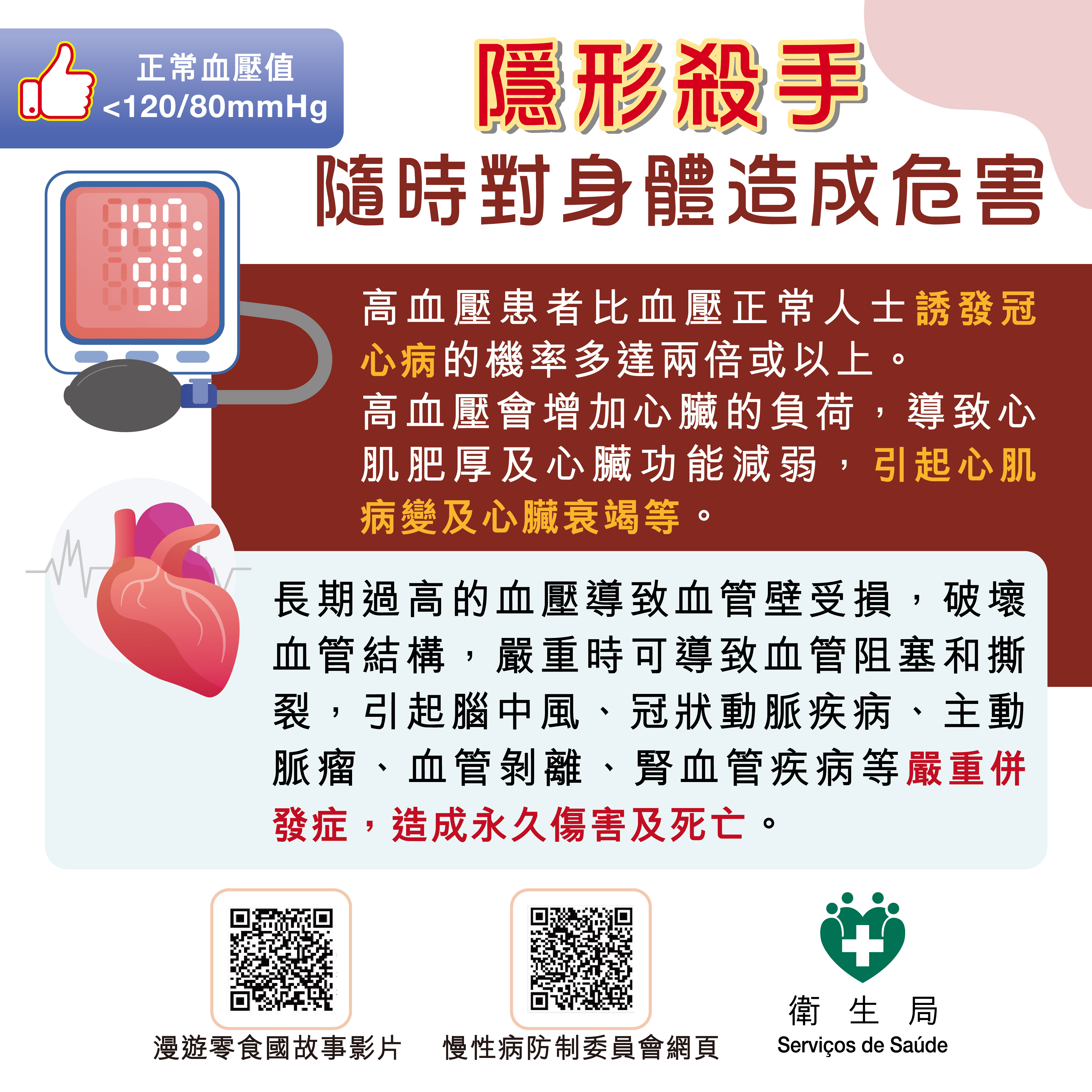衛生局為配合“世界高血壓日”,持續推動社會關注心腦血管疾病,5月至12月期間聯同健康城市委員會及慢性病防制委員會合辦、澳門美術協會協辦“保護健康心臟”繪畫比賽系列活動,期望提升本澳學童對心腦血管疾病的關注,在繪畫創作過程中了解心腦血管疾病的病因、預防方法及健康生活對預防疾病的重要性,從而激勵從小養成良好的健康生活習慣,積極建構健康的財富,遠離心腦血管疾病。是次繪畫活動分為親子組(小學一年級至三年級學生,與1位家長組隊)、初級組(小學四年級至六年級學生)和高級組(初中一年級至三年級學生),參加者可透過就讀學校報名及遞交參賽作品,6月16日截止收件,比賽結果9月上旬公佈,得獎作品於今年9至12月期間在本澳學校巡展。欲了解活動詳情及更多相關資訊,可瀏覽www.ssm.gov.mo/cpc/。