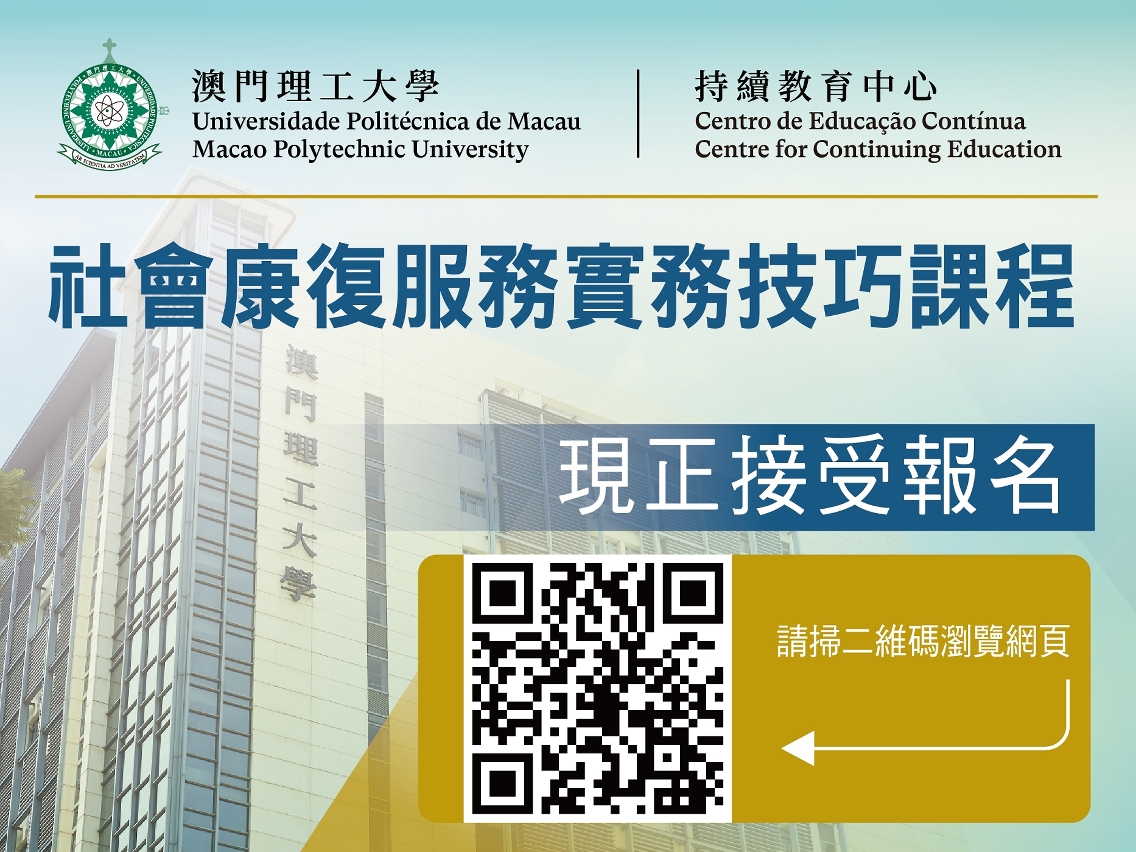 “社會康復服務實務技巧” 課程內容包括介紹“殘障”與“康復”的定義與相關基本理念、認識常見殘障類別的特性與康復需求、與康復社會工作相關的應用理論以及常用實務技巧,以及認識殘障人士家屬的需要與社會工作介入。課程以廣東話授課,可使用教育及青年發展局持續進修發展計劃個人進修帳戶支付,並已獲澳門社會工作者專業委員會認可為社會工作者持續進修活動。出席率達總課時100%並通過評測,可獲由澳門理工大學持續教育中心發出的證書。