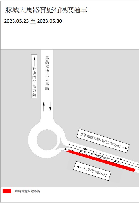 2). 由2023年6月8日至6月21日,因進行鋪設管道工程,豚城大馬路往港珠澳大橋-澳門口岸方向的其中一條行車道(約長40米)將臨時封閉,屆時將實施有限度通車。(詳見附圖3)。