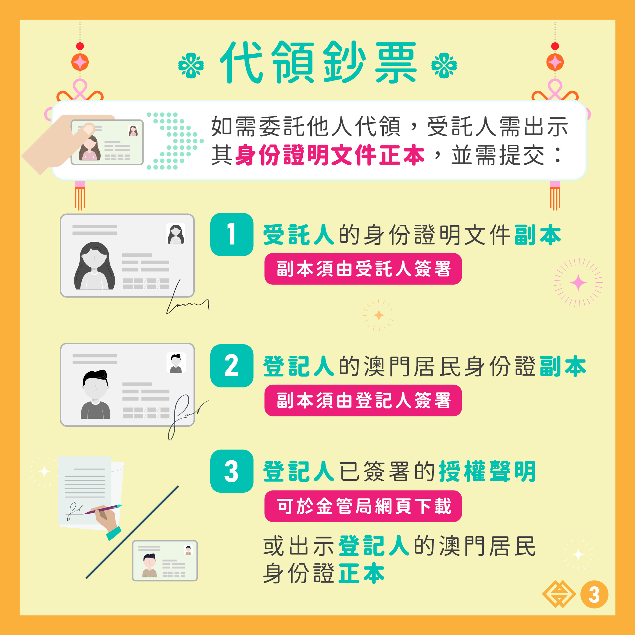 三、登記人簽署的授權聲明(可於金管局網頁下載)或出示登記人的澳門居民身份證正本。