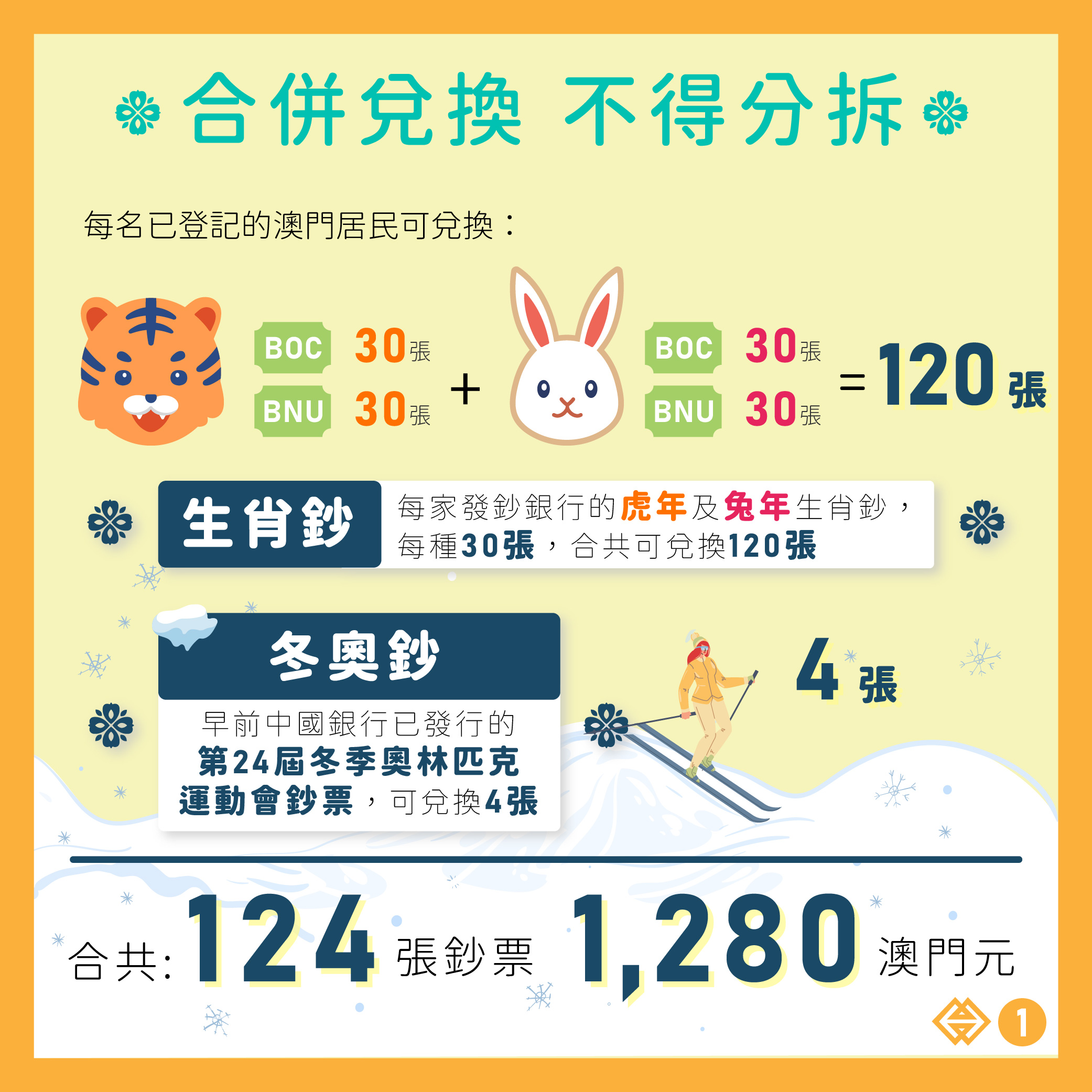 經確認實際登記人數後,每名已登記的澳門居民可兌換每家發鈔銀行發行的壬寅虎年和癸卯兔年生肖鈔各30張、中國銀行早前已發行的第24屆冬奧鈔票4張,即合共可兌換鈔票總數量為124張,兌換所涉及金額為1,280澳門元。