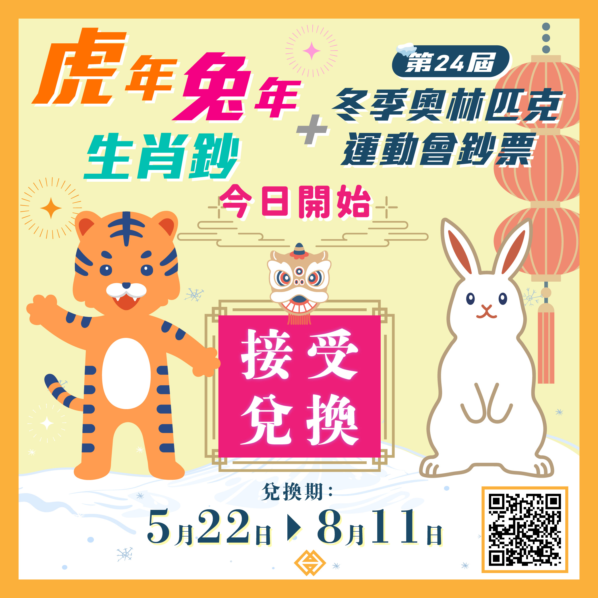 虎年、兔年生肖鈔,及早前已發行的第24屆冬季奧林匹克運動會鈔票,今(22)日起至2023年8月11日提供兌換服務。每名已登記的澳門居民可在登記時所選定日期,帶同澳門居民身份證正本到選定銀行網點,兌換由每家發鈔銀行發行的壬寅虎年和癸卯兔年生肖鈔各30張、中國銀行早前已發行的第24屆冬奧鈔票4張,即合共可兌換鈔票總數量為124張,兌換所涉及金額為1,280澳門元。