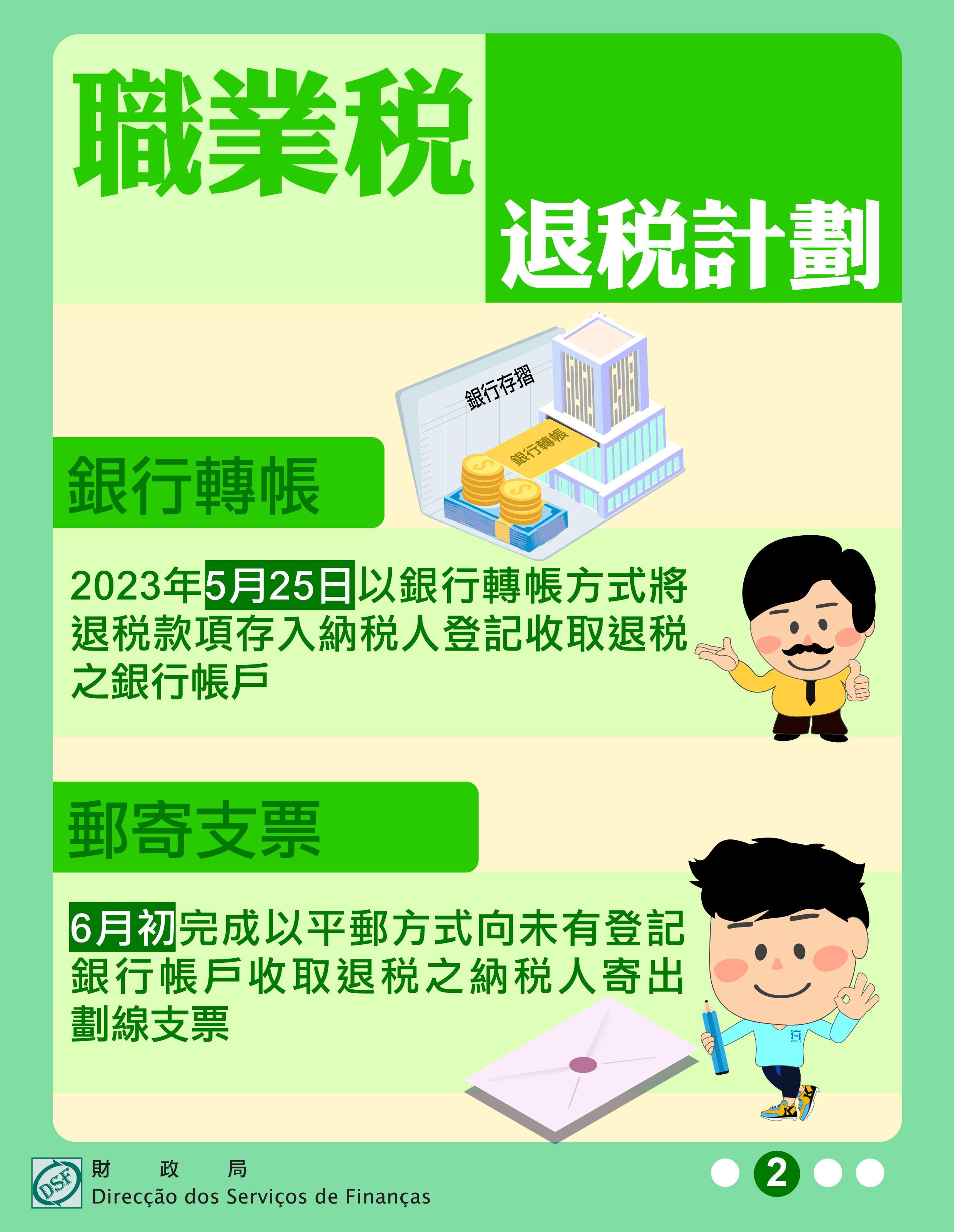 退稅款項於5月25日透過轉帳方式直接存入已登記的銀行帳戶內,而劃線支票則會按照納稅人在財政局登記的稅務通訊地址有序寄送,預計6月初完成寄送工作。